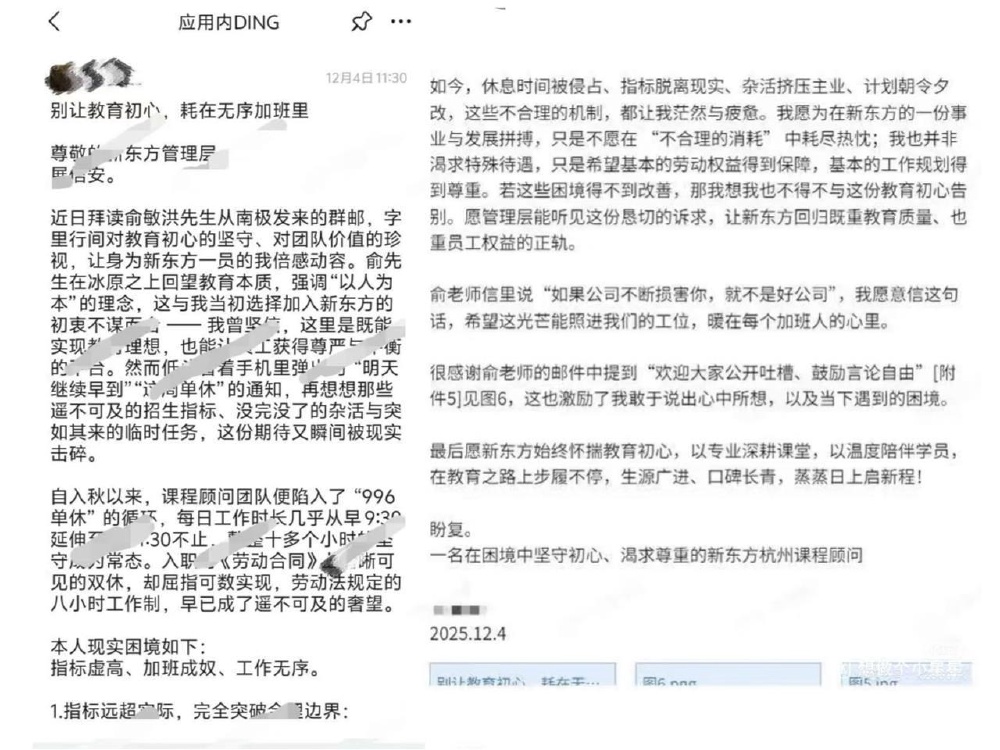 12月4日,“新东方员工发全员信”话题引发关注。据了解,一名新东方员工在公司钉钉群发布了一篇长文,控诉新东方加班文化。文中写道,俞敏洪在南极发邮表达对教育初心的坚守,强调“以人为本”的理念,但自己被困在“996单休”的循环以及完不成的招生指标中。
