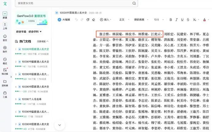 实际上,照抄“人名大全”的远不止杭州师范大学这份公示名单。记者留意到,“张吉惟、林国瑞、林玟书、林雅南、江奕云”,这5个名字是这份“人名大全”中的前五个名字,也是各类“复制粘贴”名单中扎堆出现的名字,甚至它们连排列顺序都一模一样。