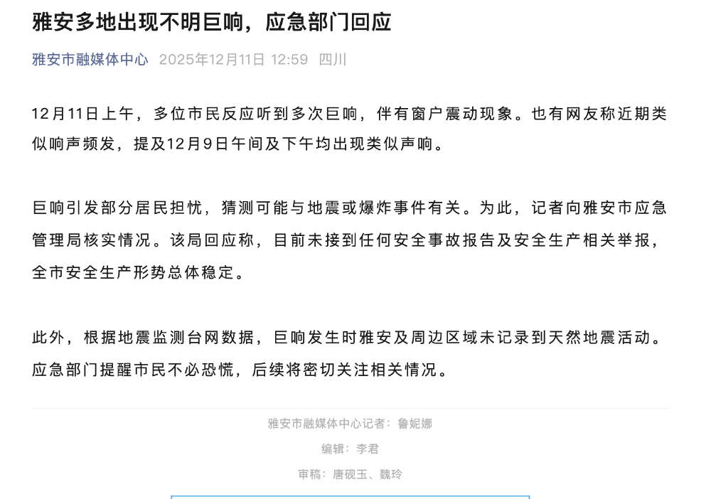 此外,根据地震监测台网数据,巨响发生时雅安及周边区域未记录到天然地震活动。应急部门提醒市民不必恐慌,后续将密切关注相关情况。