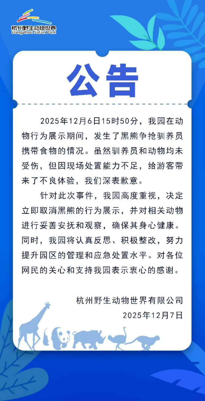 12月6日,位于杭州市富阳区的杭州野生动物世界在进行黑熊展示表演时发生了黑熊将驯养员扑倒争抢食物从而让观众受惊的事件。次日,动物园方面回应新黄河记者称,该表演节目暂停。接着,动物园官方发布通报称,决定立即取消黑熊的行为展示并将认真反思和积极整改,但该通报未表明黑熊表演的节目以后是否会恢复。12月12日,杭州市富阳区农业农村局向新黄河记者通报了对此事件的最终处理结果:以后黑熊表演全部停止、涉事驯养员停职并转其他岗位、动物园必须投资对黑熊栖息场所进行改造升级。