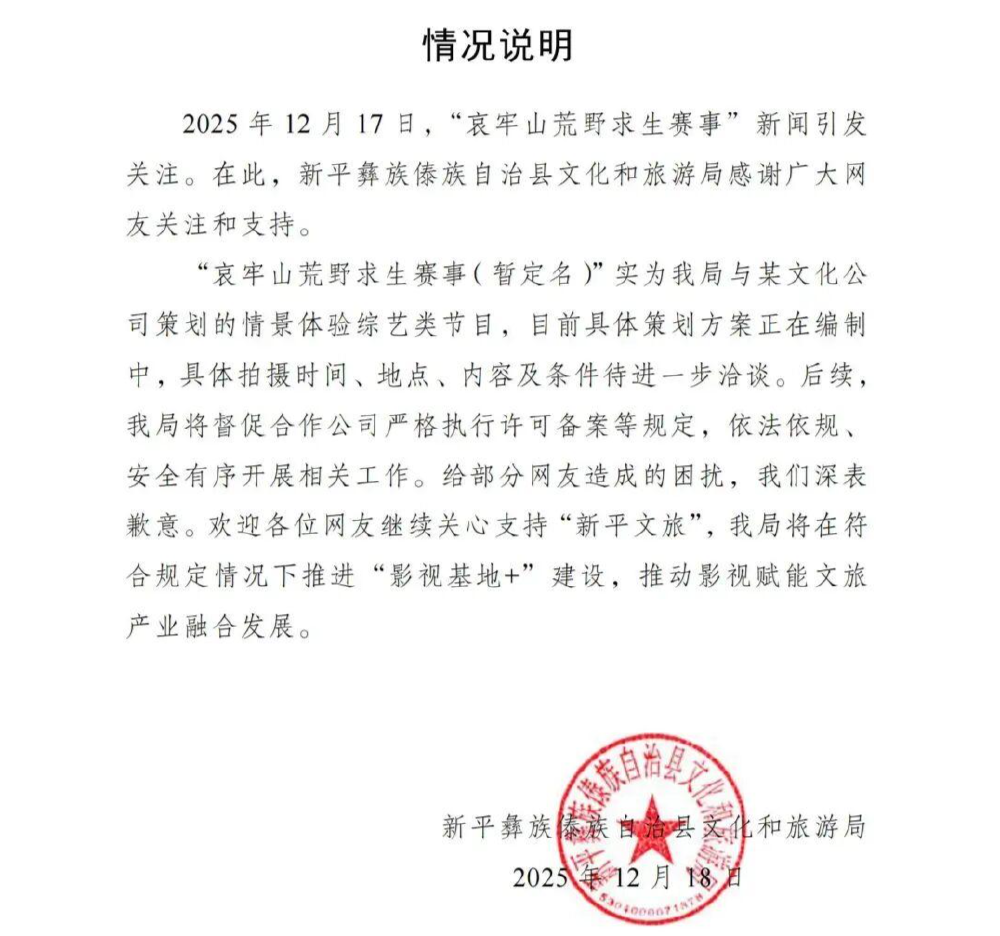 日前,“哀牢山荒野求生赛事”举办的消息引发关注。18日晚,云南省新平县文化和旅游局发布情况说明称,“哀牢山荒野求生赛事(暂定名)”实为该局与某文化公司策划的情景体验综艺类节目,目前具体策划方案正在编制中,具体拍摄时间、地点、内容及条件待进一步洽谈。后续该局将督促合作公司严格执行许可备案等规定,依法依规、安全有序开展相关工作。