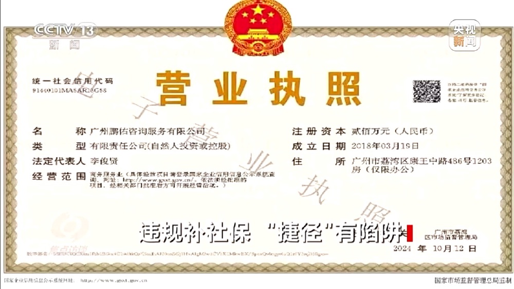 广州市公安局天河区分局刑警大队办案人员:这家公司前期确实是有帮人家办补缴社保的,但是补缴社保是有前提的,本身来找他办社保的这些人是符合条件补缴社保的,只是来办的人不了解这些政策,去找了他们,他们公司配合这个人去做了补缴社保,确实有办成功的。也存在这些公司去做假的,做假证明帮人家办了补缴社保,前期有存在。