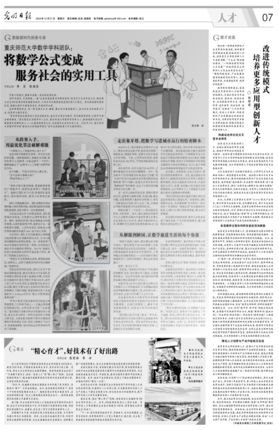 “数学支撑科技创新,应用赋能产业发展。”对团队而言,重要的不仅是解出了多少道题,更是让数学真正服务好社会。“未来,团队将持续推动数学应用落地研究与学科交叉融合,在更广泛、更深层次领域服务国家战略以及重庆区域发展需求。”杨新民说。