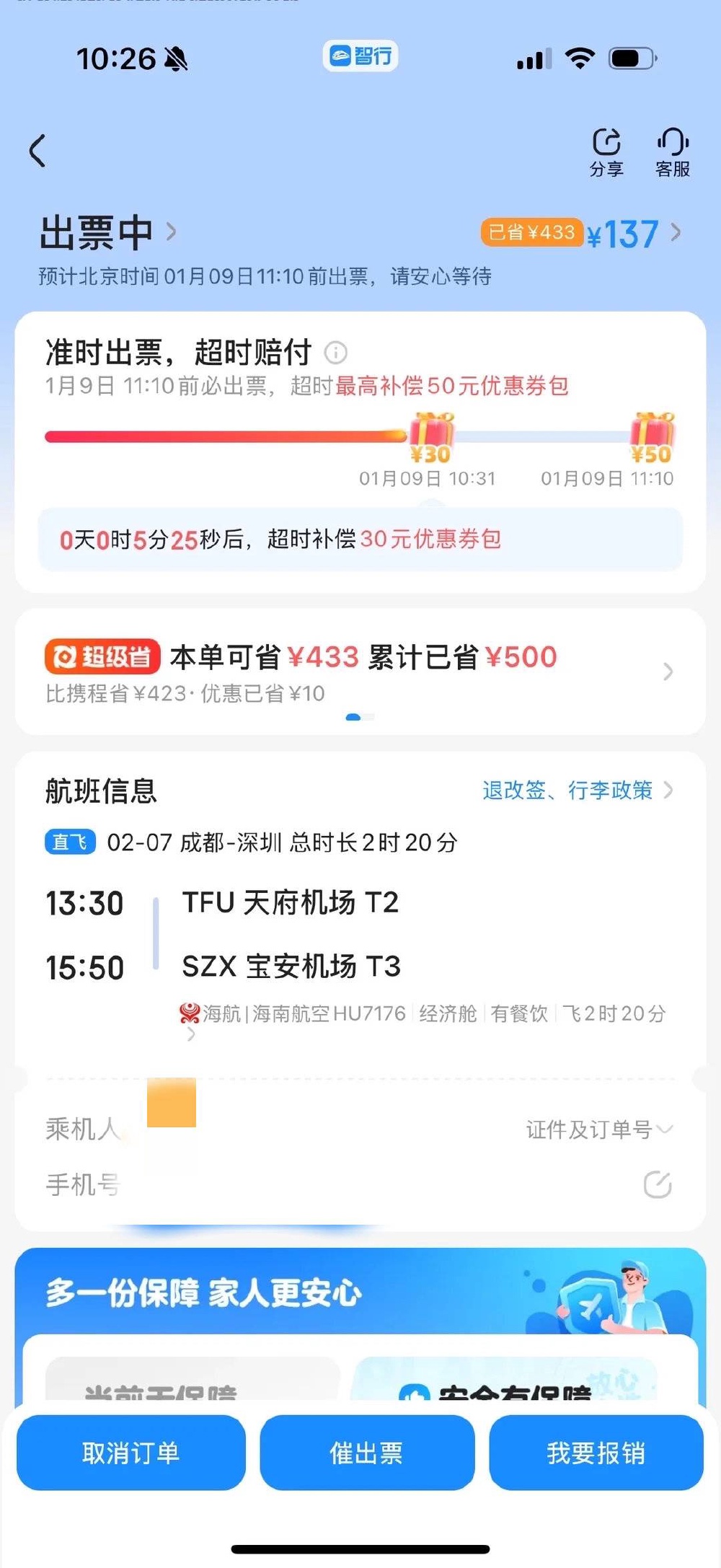 晏女士说,她在10点24分完成了支付。当时,订单页面显示,“1月9日11:10前必出票,超时最高补偿50元优惠包。”