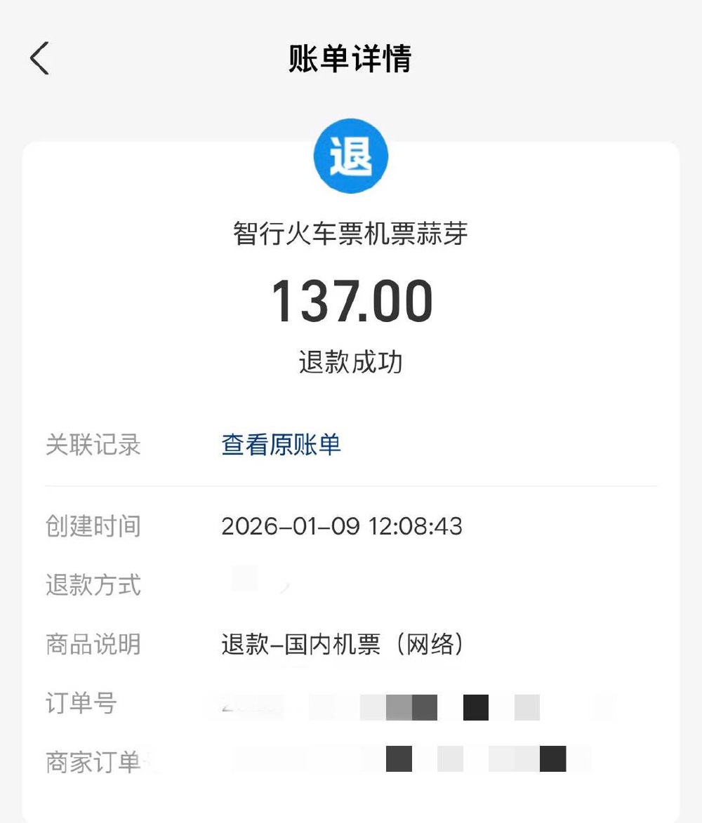 然而,一直等到中午,订单还一直显示“出票中”。11点54分,晏女士拨打了智行的客服电话,“他们说是航司那边的问题,说出了bug,肯定出不来票了。”挂完电话没多久,12点08分,晏女士收到了“退款成功”的消息。订单状态也变成了“已取消”。