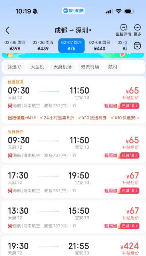 晏女士当时的截图显示,2月7日上午,两条从成都天府国际机场飞深圳宝安机场的票价只要65元。“之前一直都是400多元、500多元,确实便宜了不少,我就选了个下午的航班,137元。”