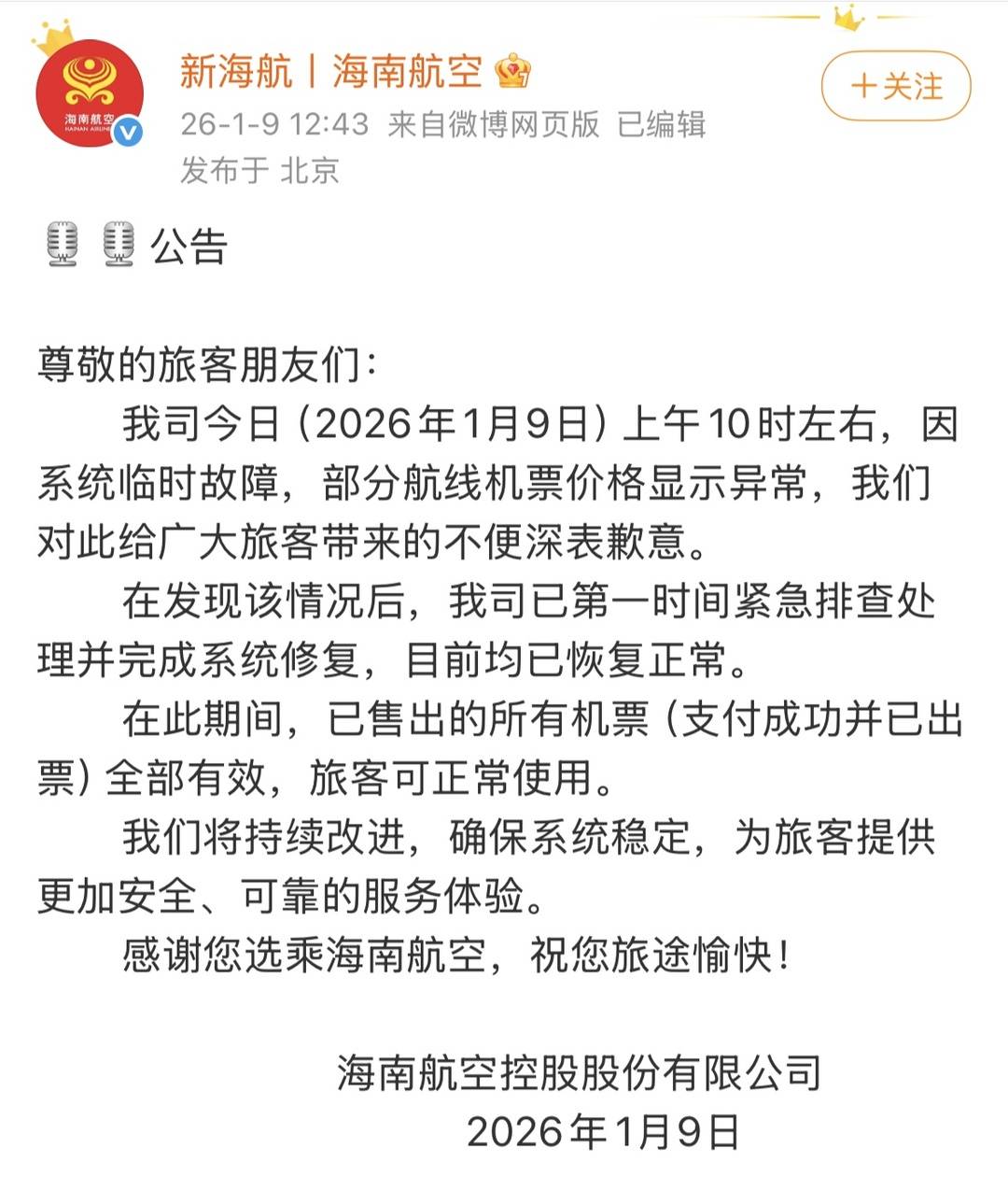 1月9日中午,海南航空官方微信发布公告对此次“超低价”机票进行了回应。