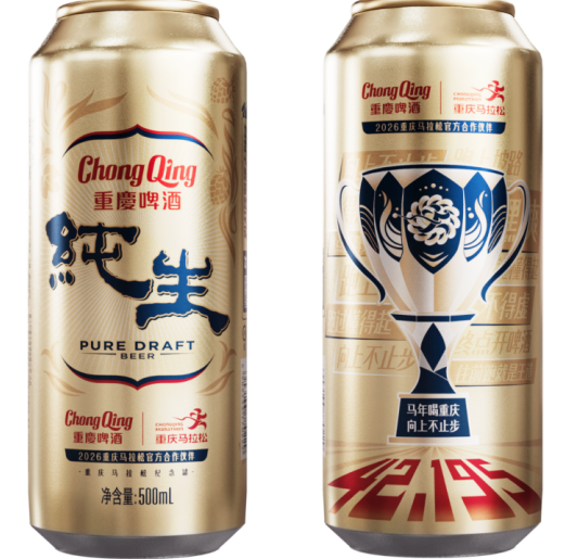 本次联名纪念罐设计巧思十足,以纯生经典罐体为基底,采用扁平化与现代插画结合风格,麦芽金为主调搭配经典红与深蓝,视觉热烈又稳重。瓶身背面以奖杯为核心,融入重马奖牌标志、山城山水元素及重庆特色励志短句,更将 42.195K 马拉松赛程化为跑道设计,满含对跑友的美好期许,兼具纪念意义与本土风情。