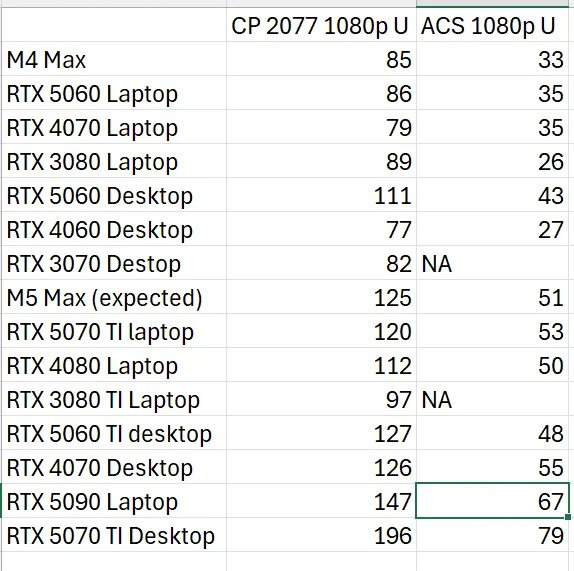 IT之家注意到,Reddit 论坛一位账号名为 Cheap-Ability9453 的用户,耗时整理了一份英伟达多款桌面端及移动端显卡的性能对比数据,并将这些显卡与 M4 Max、苹果即将推出的 M5 Max 进行横向比较。测试选取了《赛博朋克 2077》与《刺客信条:影》两款游戏,分辨率统一设为 1080p,画质预设调至“极致”档位。该用户表示,数据均来源于科技评测网站 Notebookcheck,其中 M5 Max 的预估性能,是结合 Apple Silicon 历代产品的性能提升幅度推算得出。