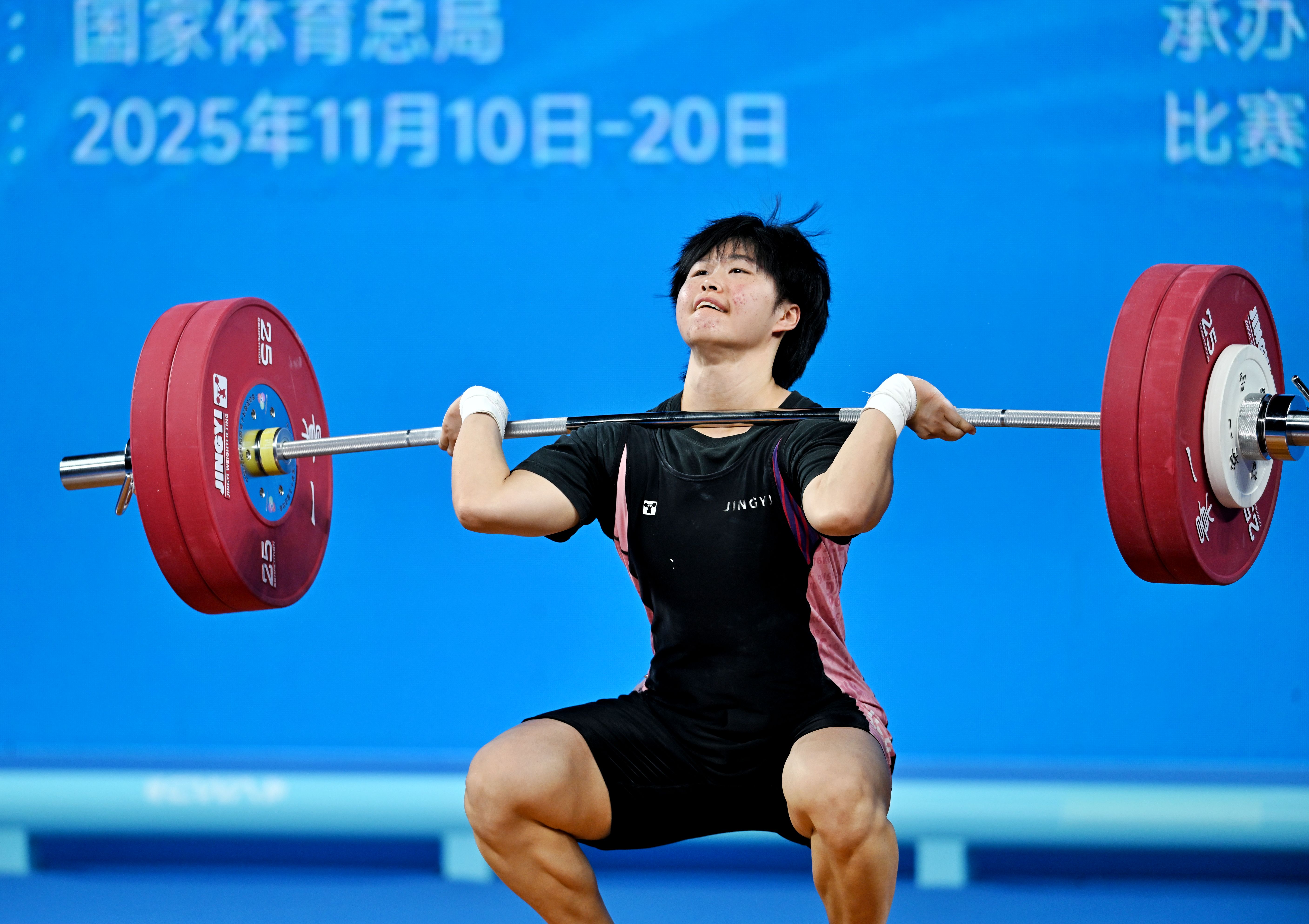 ▲11月12日,广东东莞石龙中学体育馆,举重女子64公斤级决赛现场,重庆运动员李霜在比赛中。首席记者 龙帆 摄