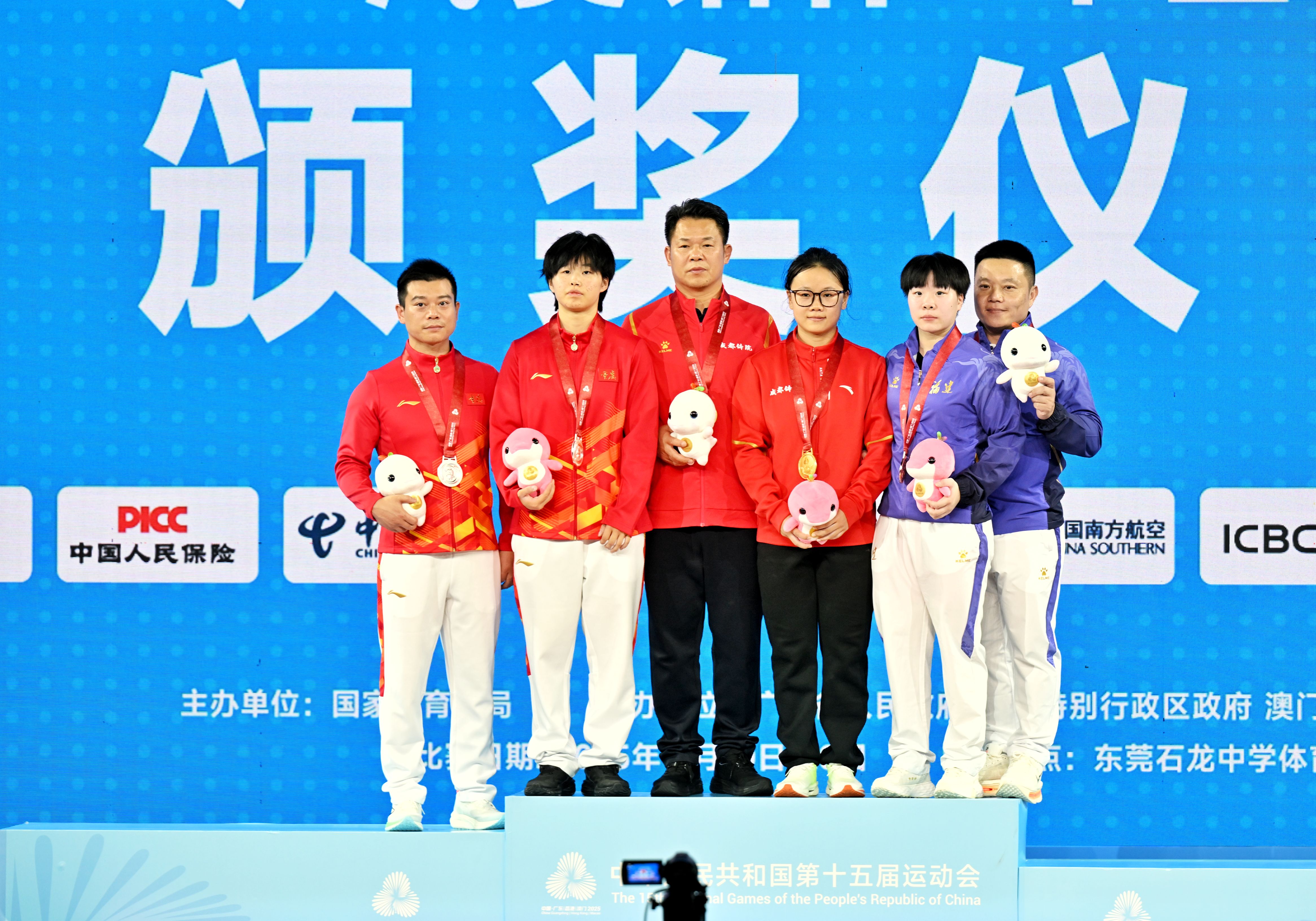 ▲11月12日,东莞石龙中学体育馆,举重女子64公斤级决赛颁奖仪式上,运动员和教练员拍照留影。首席记者 龙帆 摄