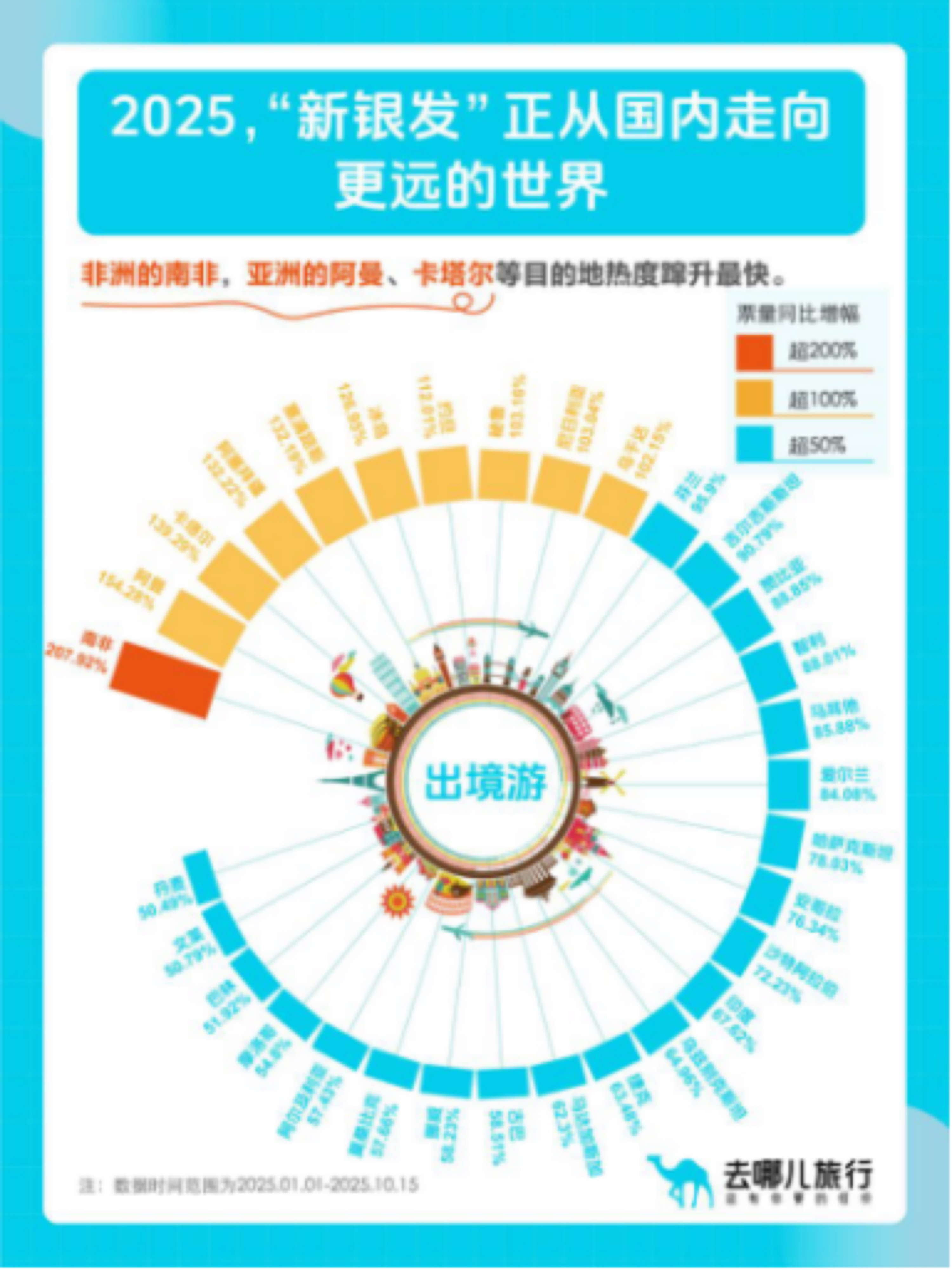 该平台数据显示,今年1—10月,该平台上55周岁至70周岁的“银发族”已乘坐飞机打卡了全国255个城市。在出境游方面,“银发族”今年的国际机票订单量同比增长了19%,飞往境外的1452个城市,比去年增加了110个目的地。他们秉持“该省省,该花花,关键是适合自己”的消费观,在购买的出境机票中,直飞航班票量占比达到44%。