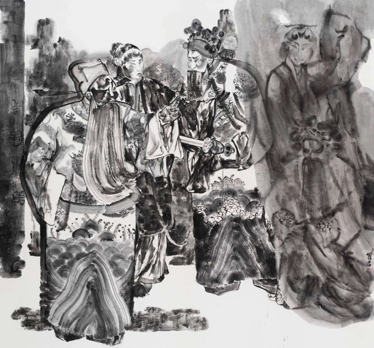 在笔墨语言上,该作品融合宿墨的沉凝与油烟的光润,包拯的刚正、陈世美的阴鸷、秦香莲的惶恐,皆因笔墨分明,使画面在笔墨碰撞中强化叙事性与氛围感,进而重构戏曲的听觉冲击为视觉张力。