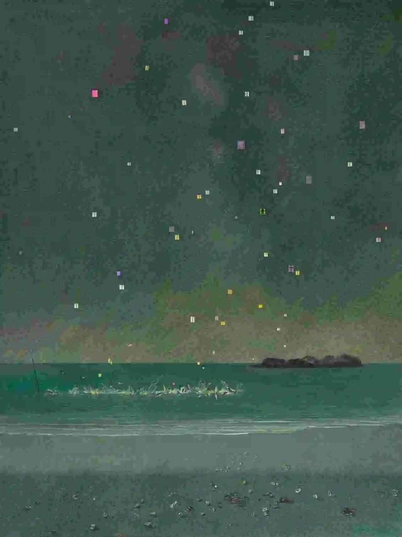 该作品创作上践行“应物赋格”理念,以“刷”笔表现海面柔顺,用“点”皴勾勒星光璀璨,以“细节真实而场景超验”的手法,超越自然主义再现,引发对生命坚韧与自然无常的反思。