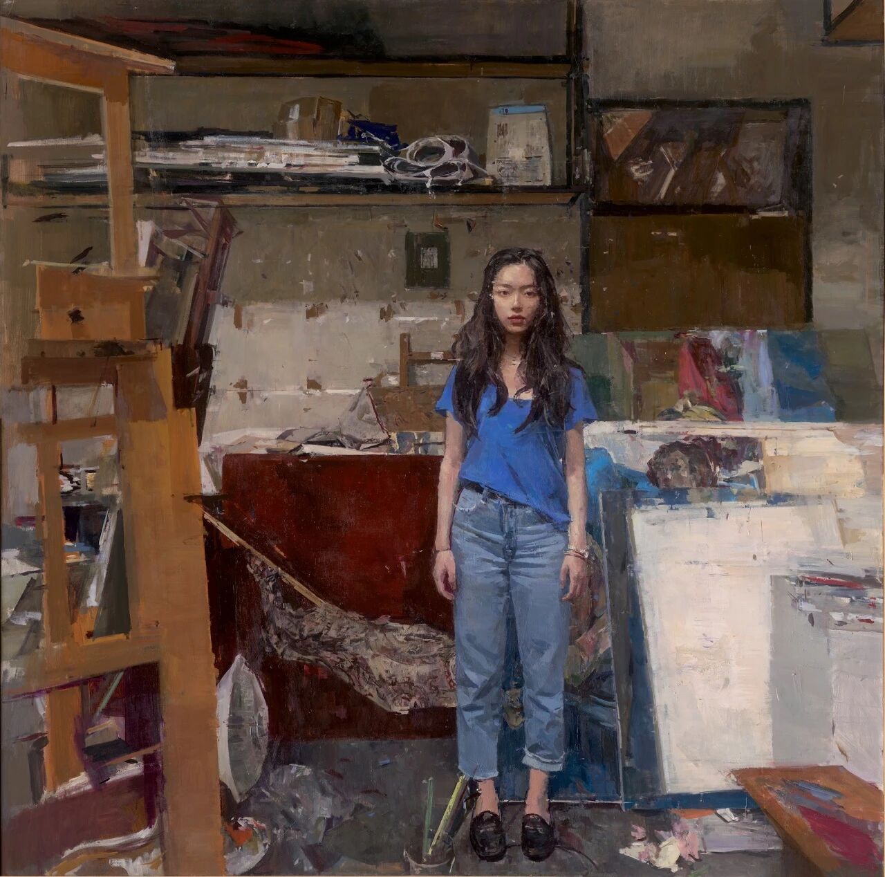在这件作品中,他表现了画室中一位女子沉浸在思绪中的片刻沉静。身旁的红色沙发、搭着的衬布,以及散落的画架与画框,都保持着使用后的自然状态,希望呈现物与物、人与环境之间那种不偏不倚的质朴氛围。