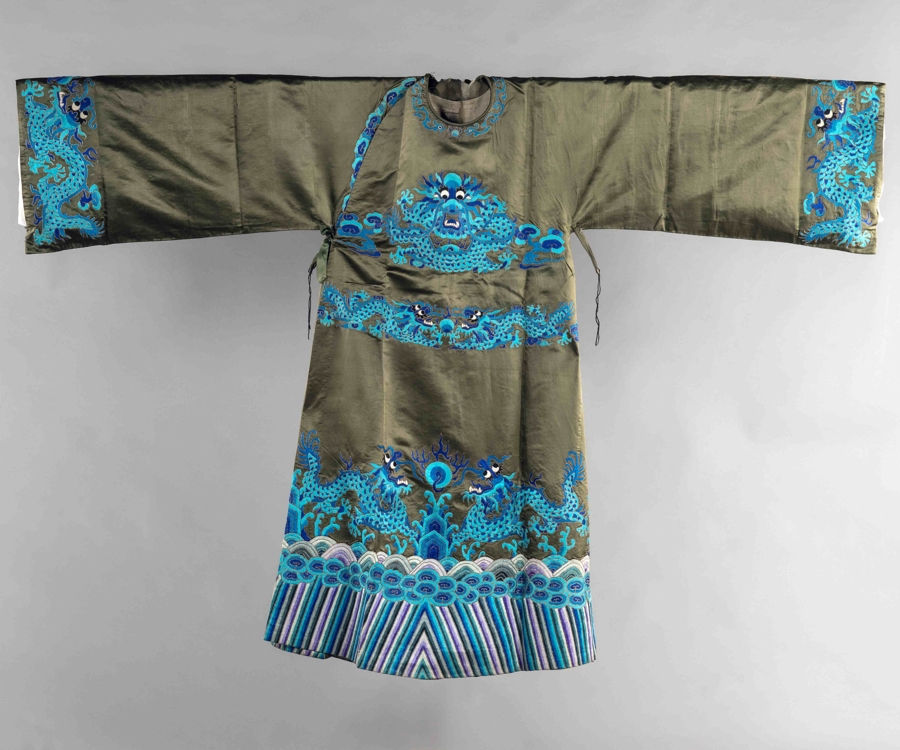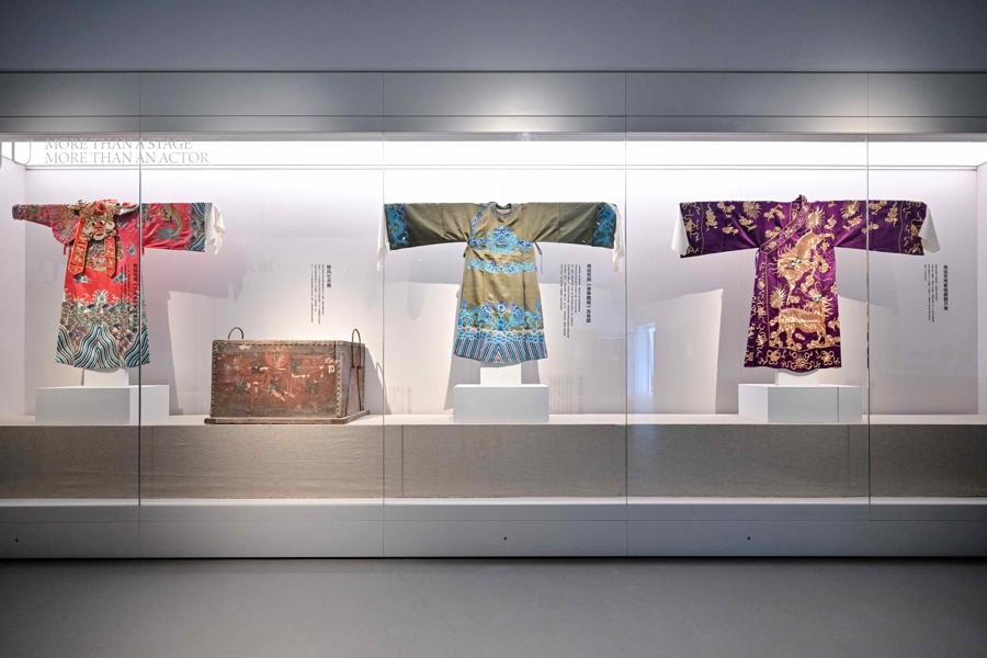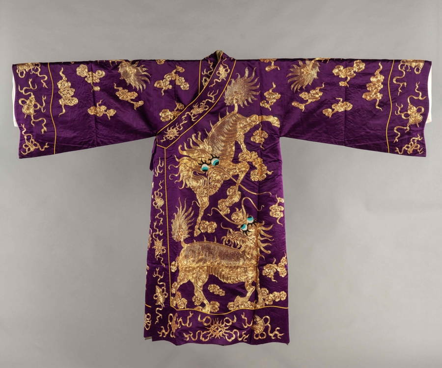 ▲周信芳穿过的紫缎麒麟开氅首次公开展出。