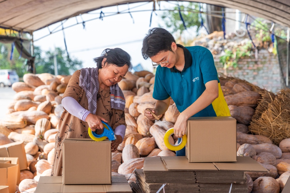 ▲垫江县白家镇,邮政工作人员与农户协作,在南瓜堆旁封装货物,助力农产品外销。受访者供图