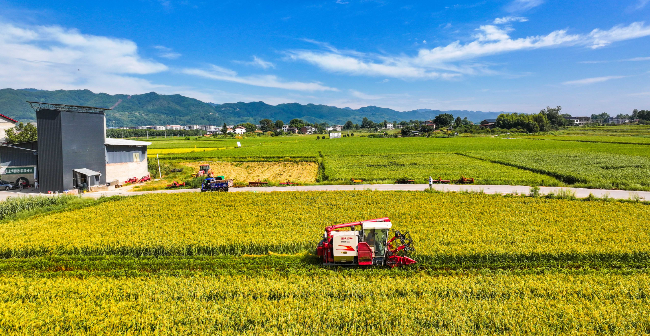 ▲8月25日,垫江县沙坪镇李白村水稻制种基地,农机穿梭在稻田里收割水稻。(资料图片)特约摄影 龚长浩