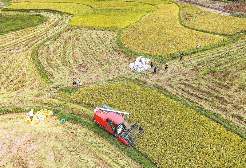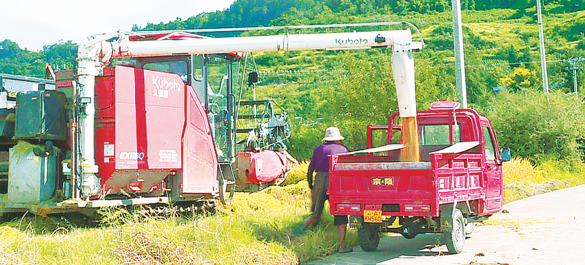 ▲农民加快收割水稻。通讯员 王晓宇 摄