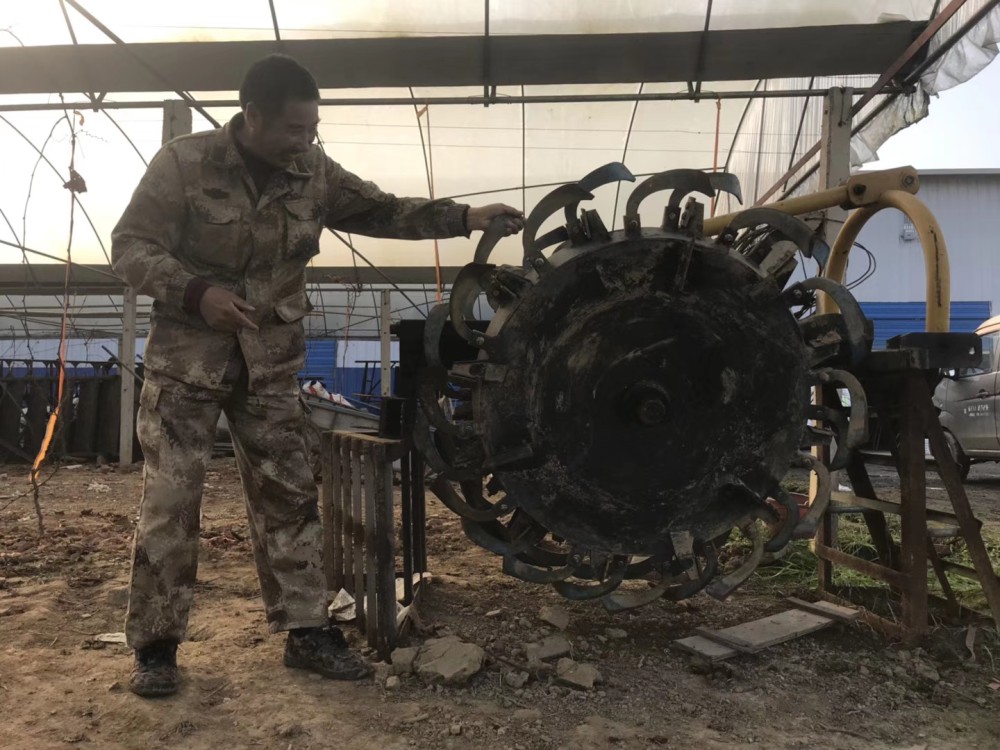 “一排葡萄40米,一个青壮年一天能切完,那就算能干了。”黄林国介绍,为了提高工作效率,他参考松土机,买来了10把菜刀,拿起几块钢材,自己设计了一架“切根机”。这个突发奇想效果出乎意料地好——拖拉机拉动切根机,菜刀从地里一下子划过去,葡萄的主根断得整整齐齐。