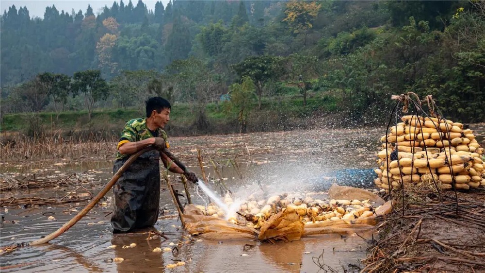 莲藕采挖工余明强说:“一个人每天可以挖700至900斤莲藕。挖藕还是有技巧的,不能断,不能伤藕,才能保证它的质量。”他们上午挖藕,下午清洗莲藕,晚上将莲藕运往重庆中心城区销售。
