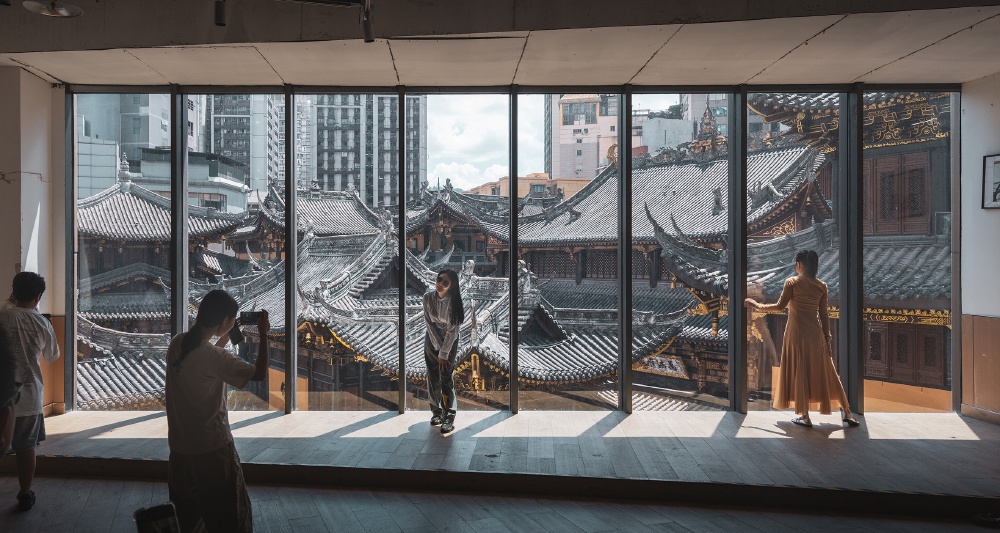 ▲10月12日,紧邻罗汉寺的商圈落地窗,成为游客们的“隐藏打卡地”。记者 张春晓 摄