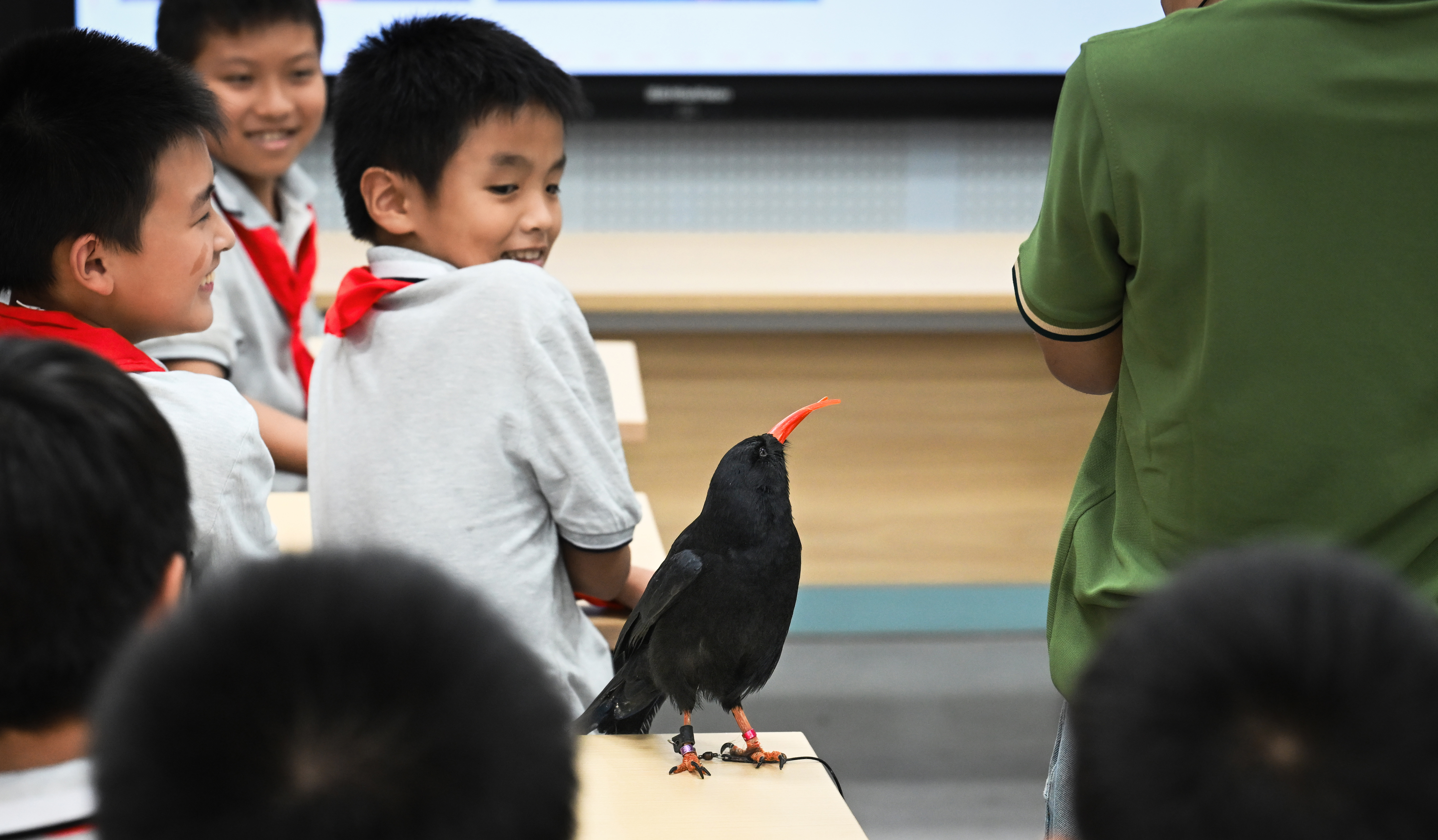▲10月11日,沙坪坝区矿山坡小学校,重庆动物园鸟类保育员带来的红嘴乌鸦好奇地飞落在课桌上“听课”。记者 张锦辉 摄