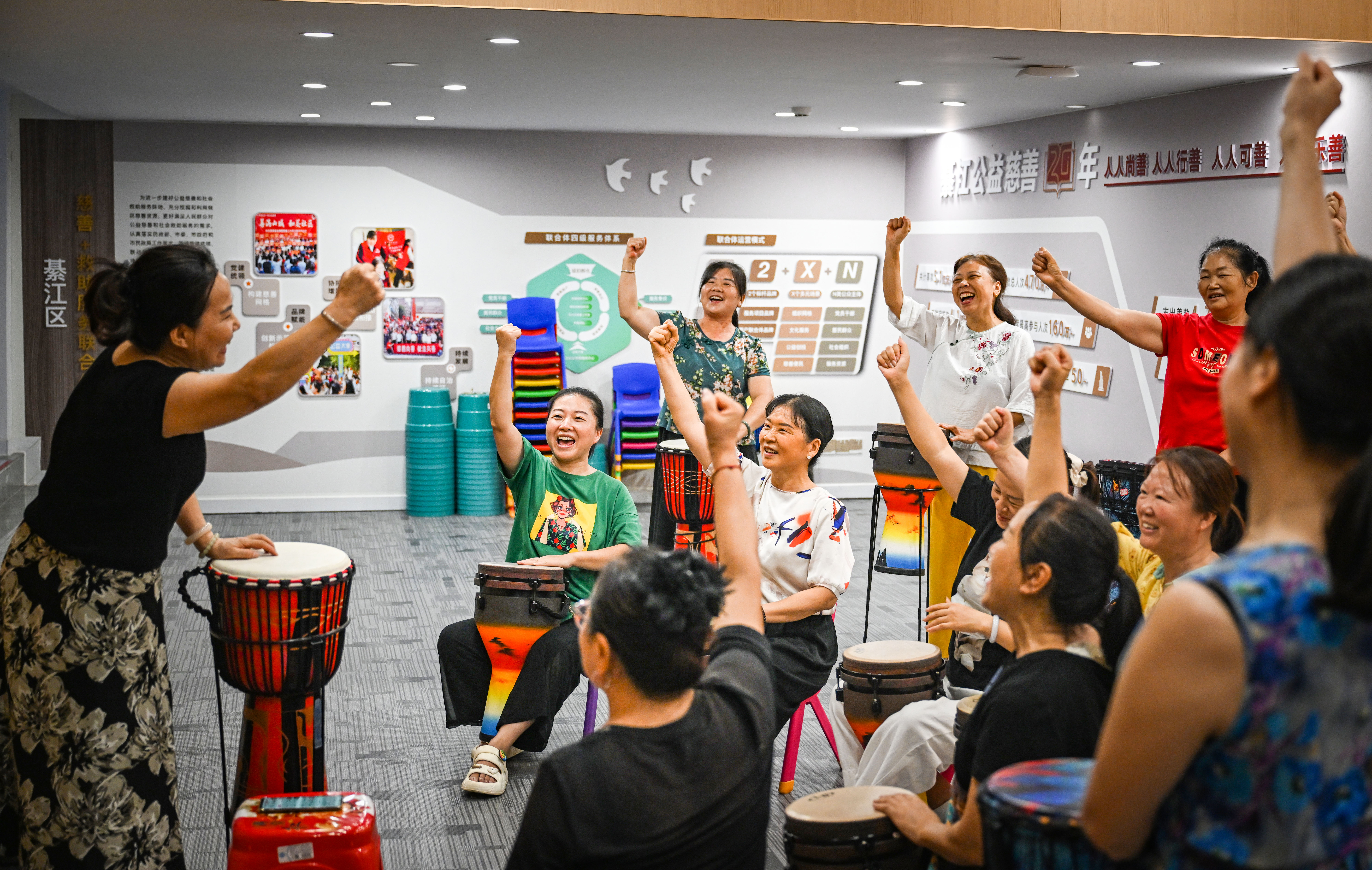 ▲10月11日,綦江区文龙街道双龙社区综合服务体,艺綦嗨鼓队队员正专注练习非洲鼓。首席记者 龙帆 摄