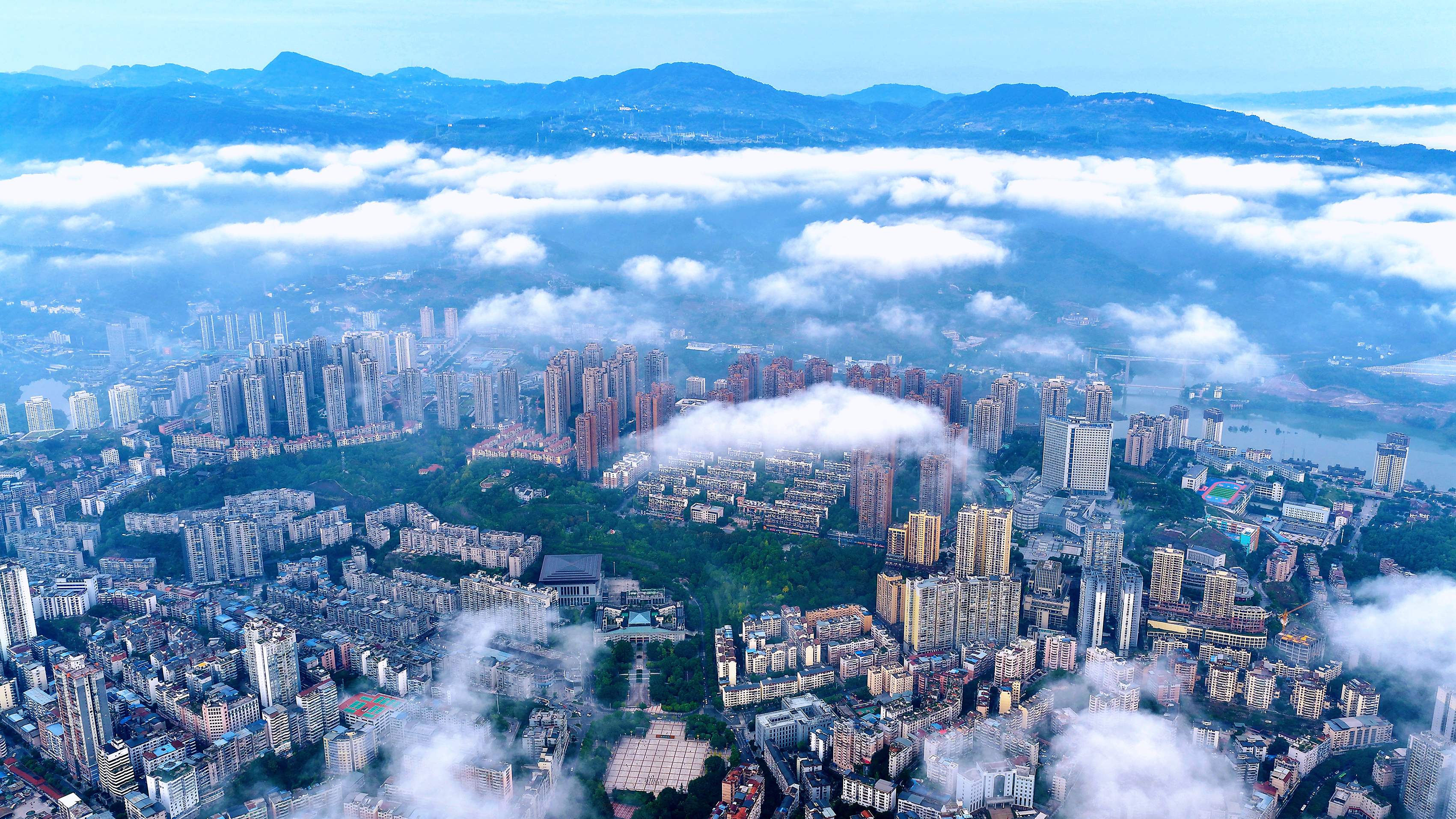 ▲2025年10月29日清晨,云遮雾绕下的忠县县城美如画卷(无人机照片)。通讯员 赵军 摄