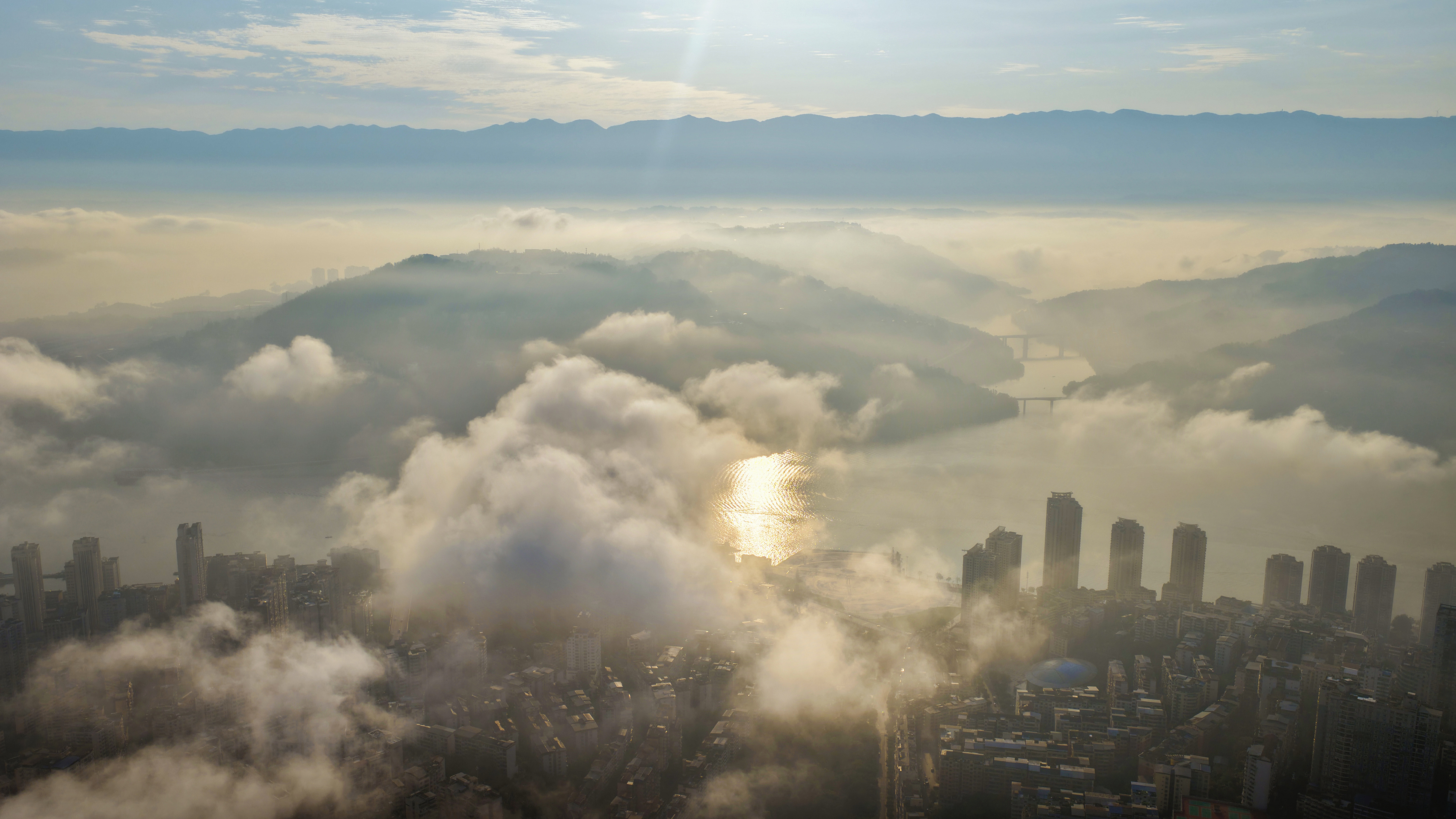 10月29日清晨,长江忠县段出现大范围流云景观,缥缈的云烟缭绕在山河之间,美轮美奂,宛若仙境。江风徐来,云雾随风游走在街区楼栋之间,好一幅美不胜收的自然画卷。