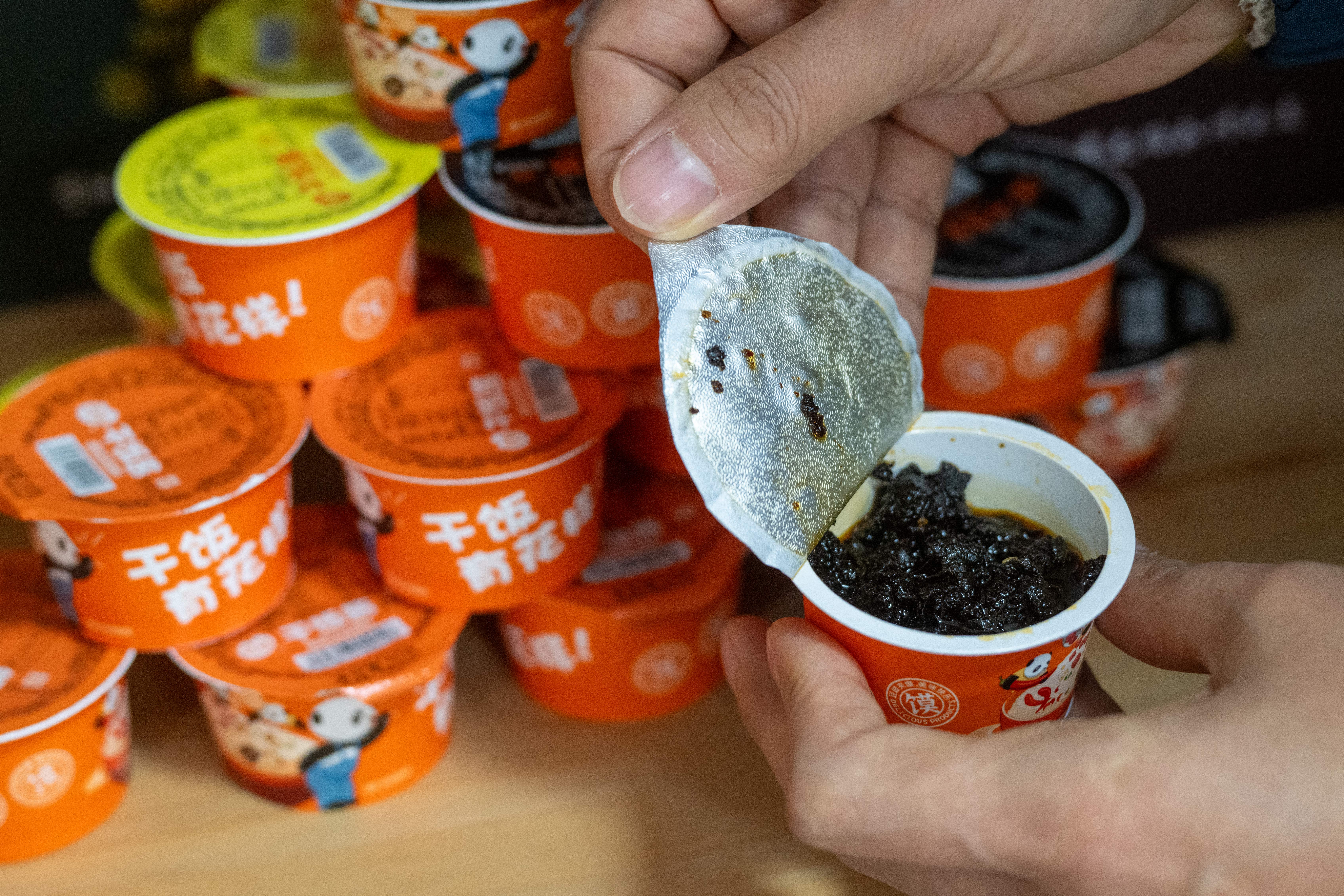 ▲10月30日,永川国家高新区三教产业园菽乡(重庆)农业科技有限责任公司,一名客人好奇地撕开“双十一”爆单的豆豉单品。记者 崔力 摄