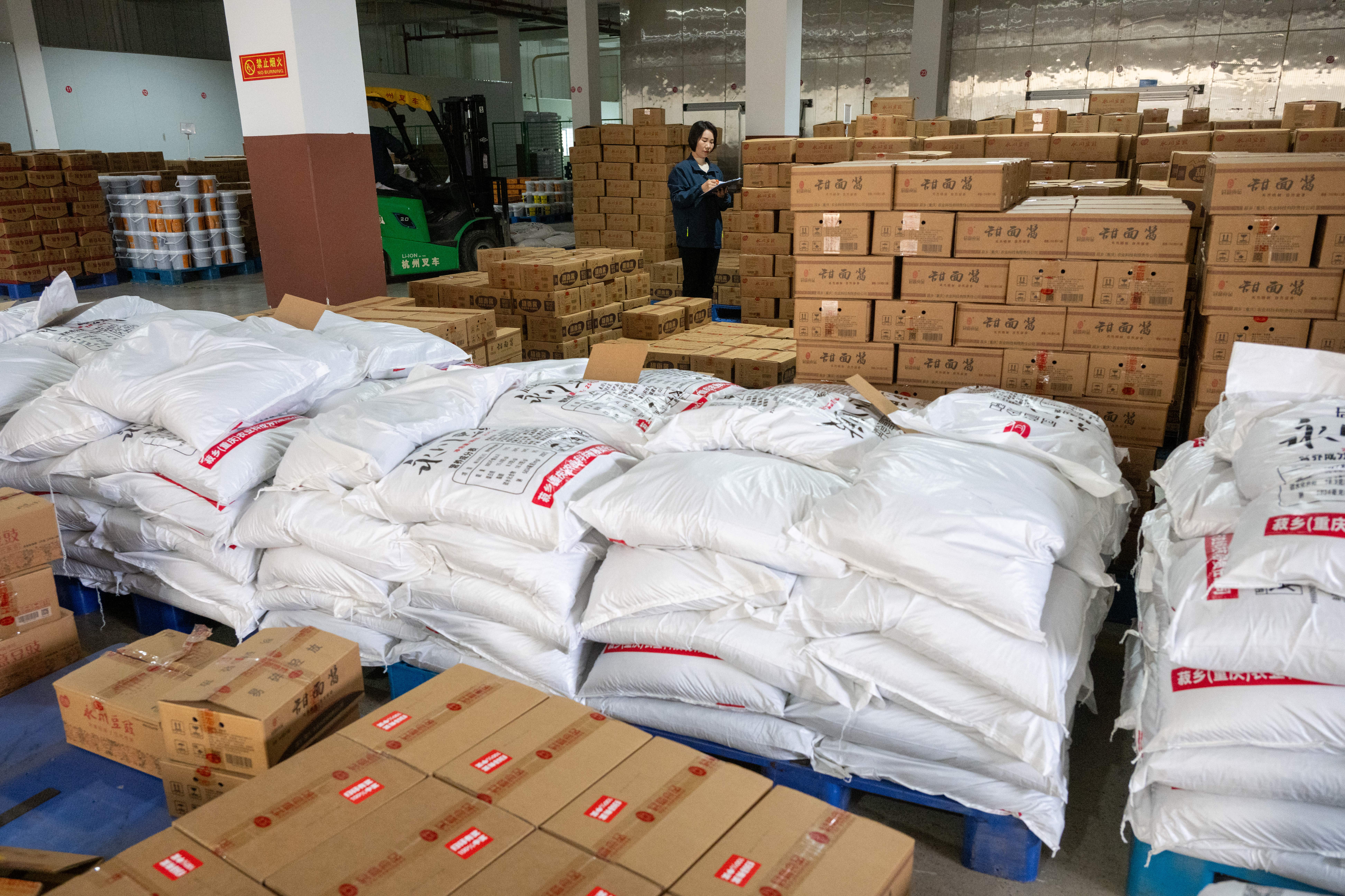 ▲10月30日,永川国家高新区三教产业园菽乡(重庆)农业科技有限责任公司,工人在库房清点进出库情况。记者 崔力 摄