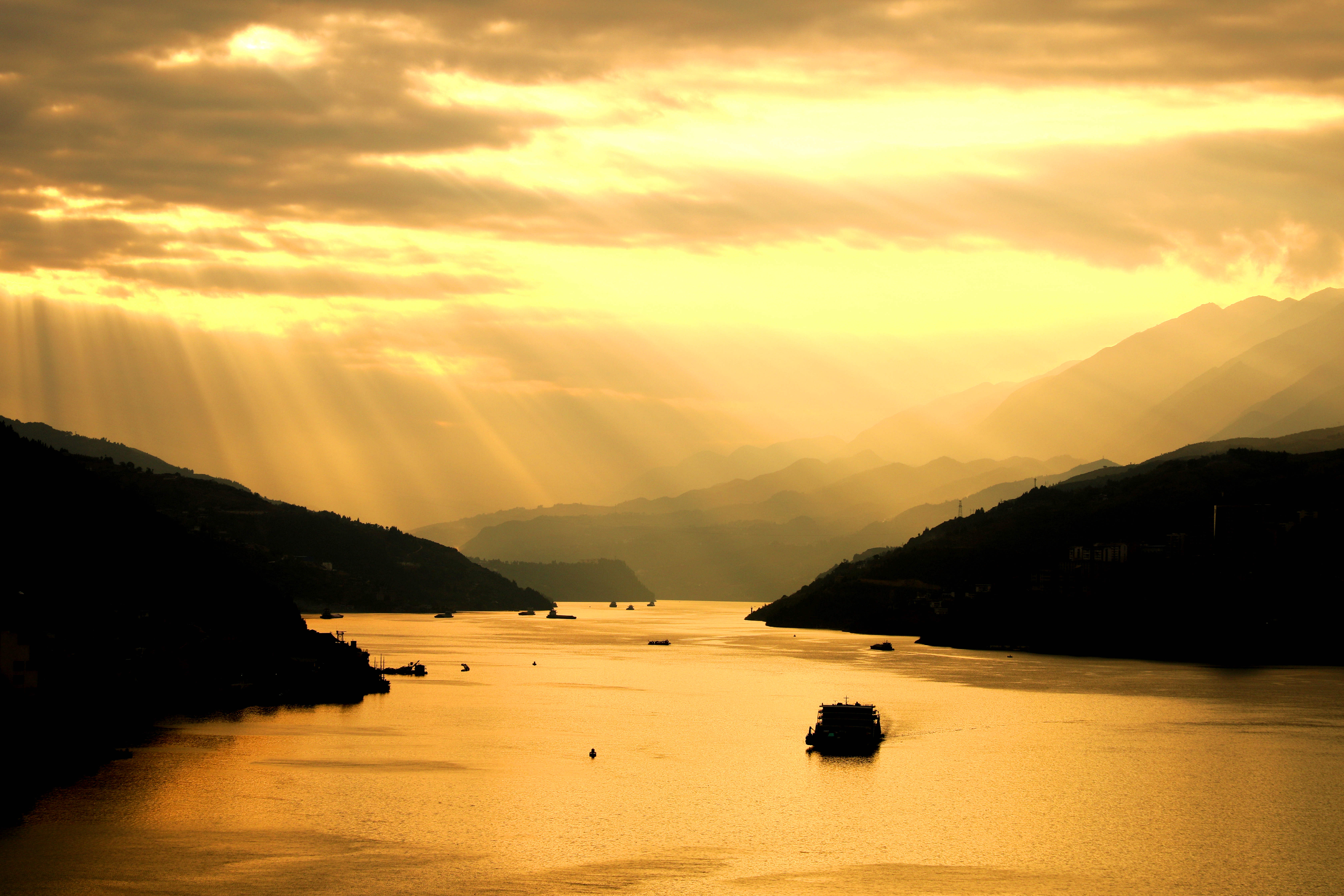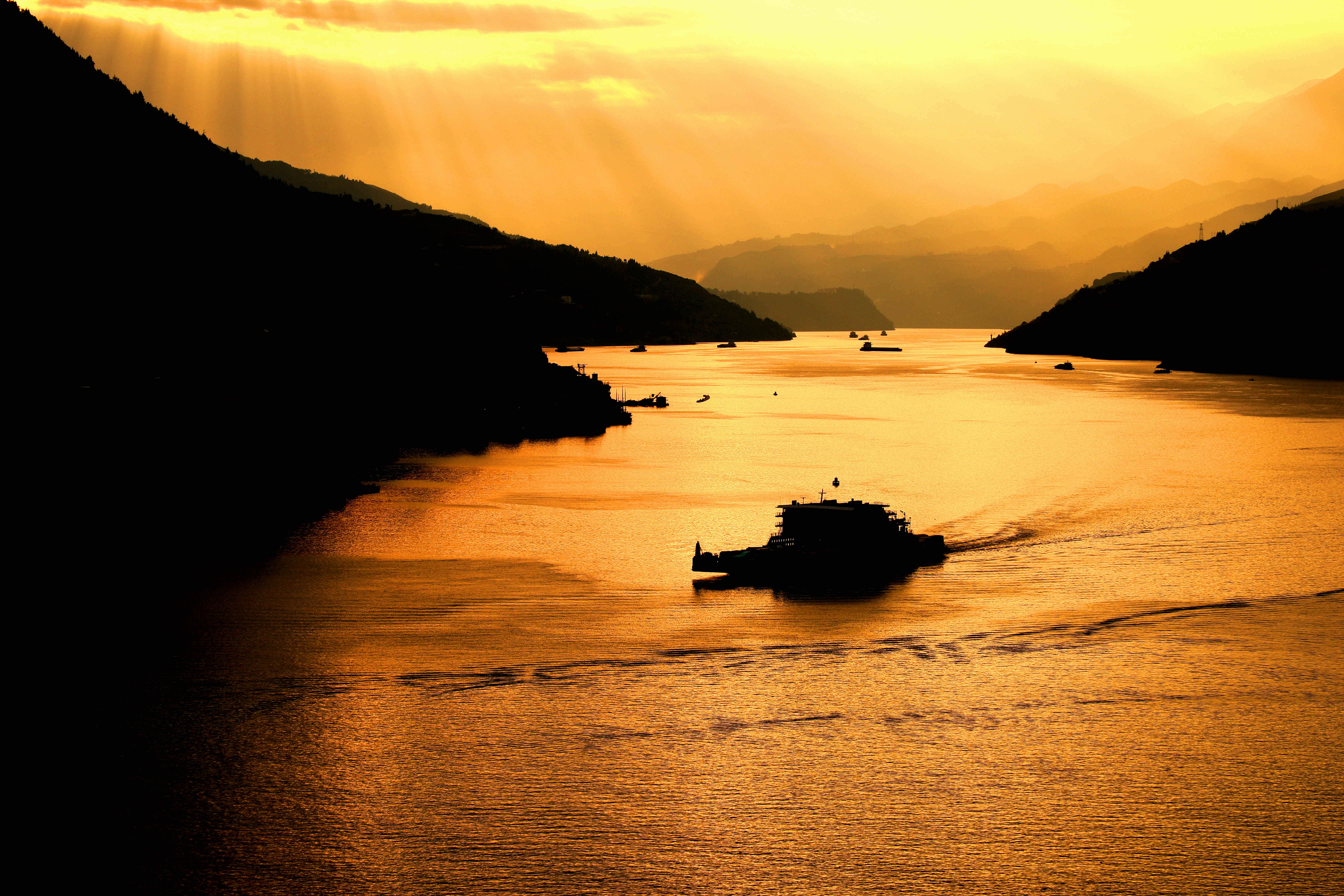 当日,落日时分,太阳光穿透云层,形成美丽的丁达尔效应。阳光投射江面,宛若长江铺金。峡江两岸,峰影如剪。船行其中,美丽如画。