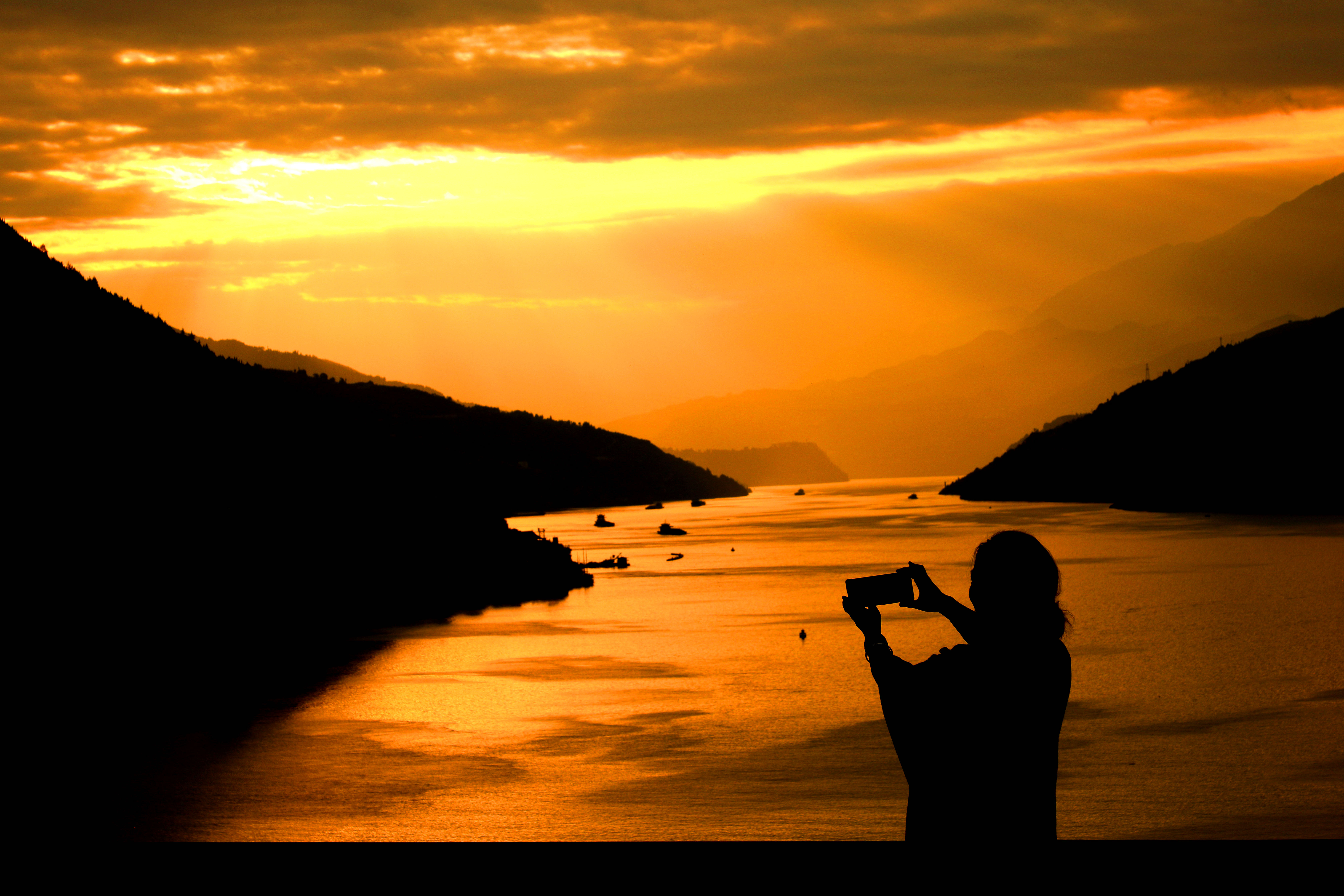 ▲10月30日,巫山县,游客在拍摄落日余晖映照下的长江三峡巫峡美景。特约摄影 王忠虎