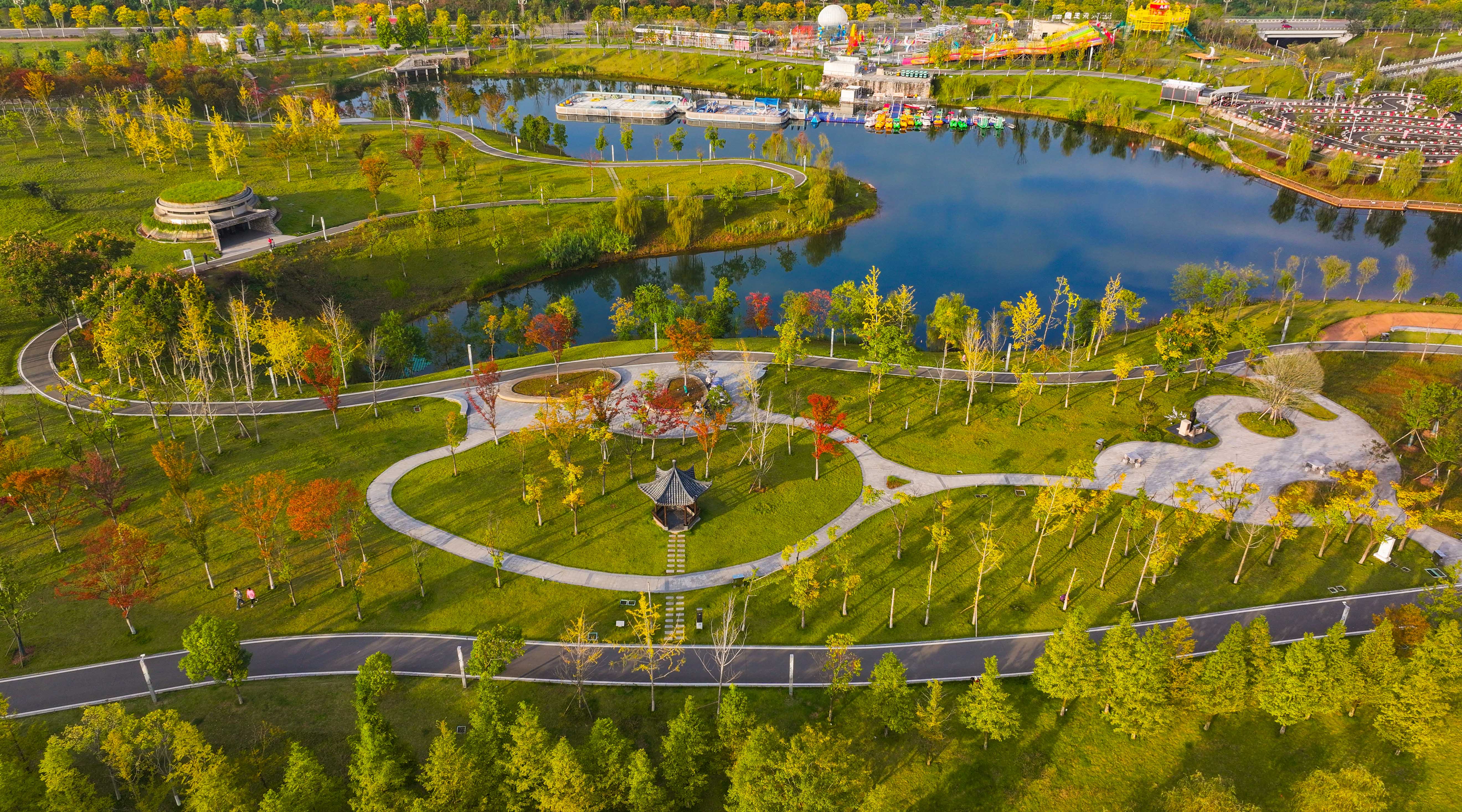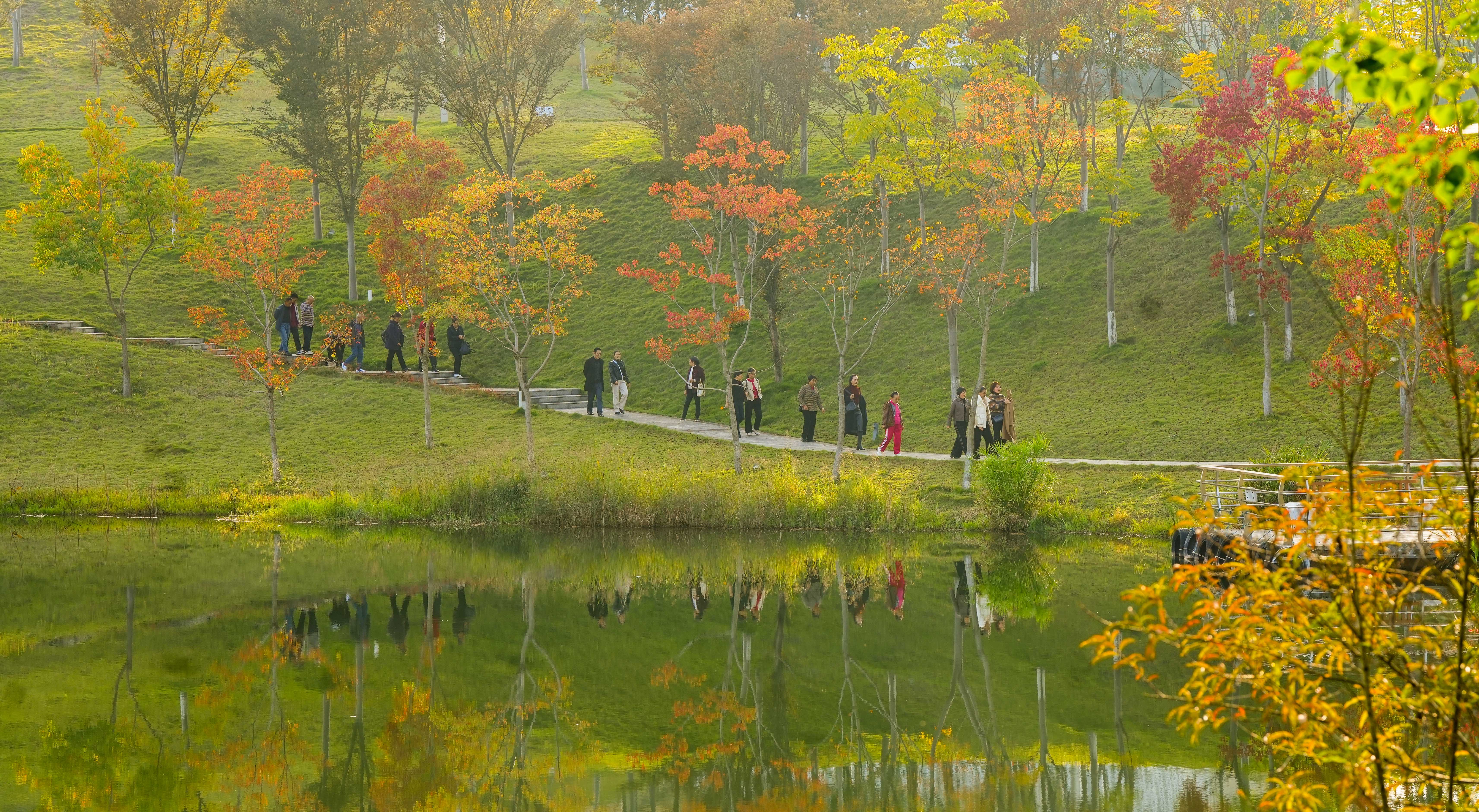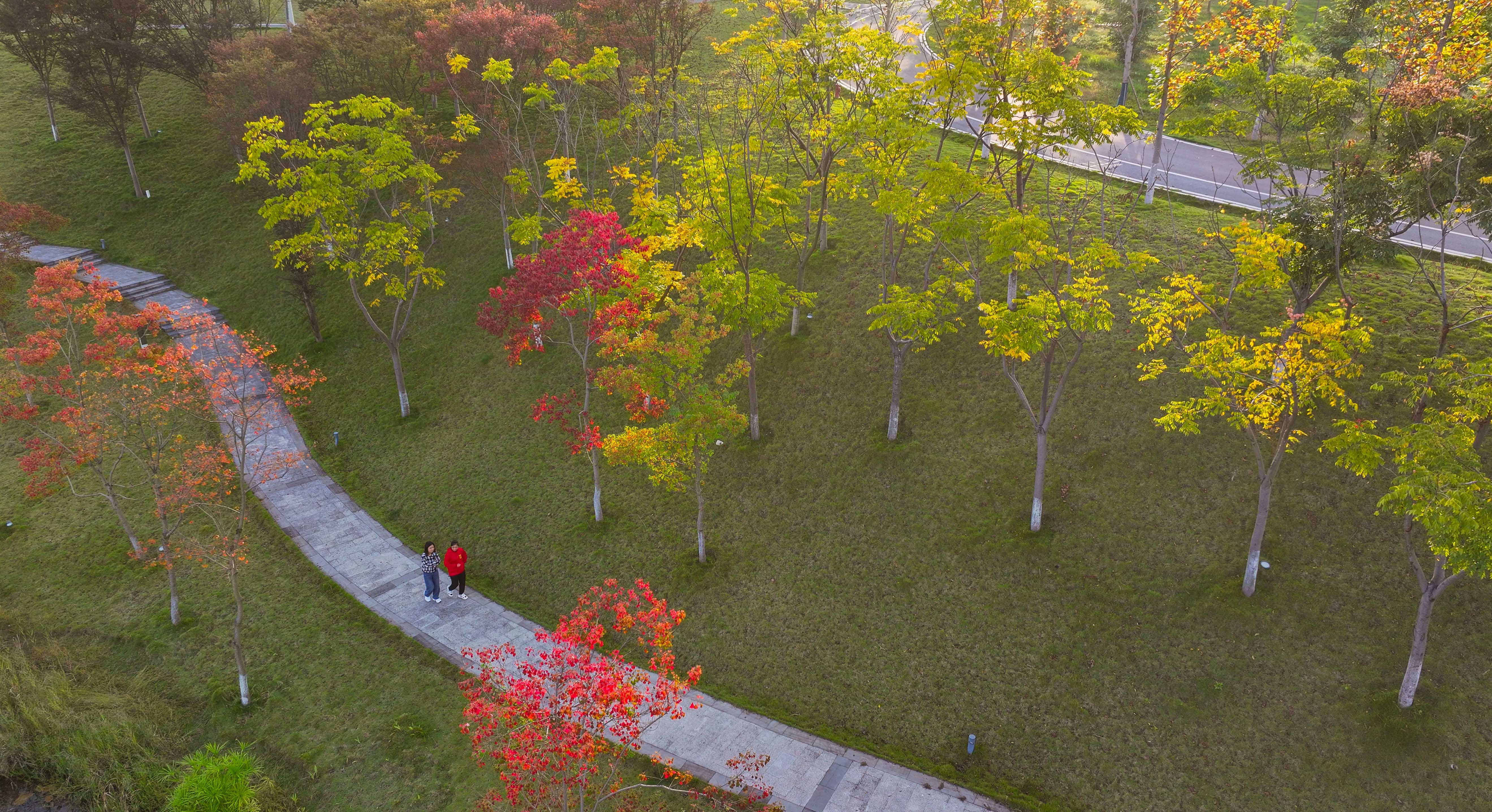 当日,垫江县桂溪街道三合湖湿地公园,五彩斑斓的公园景色宜人,市民或漫步或观景,十分惬意。