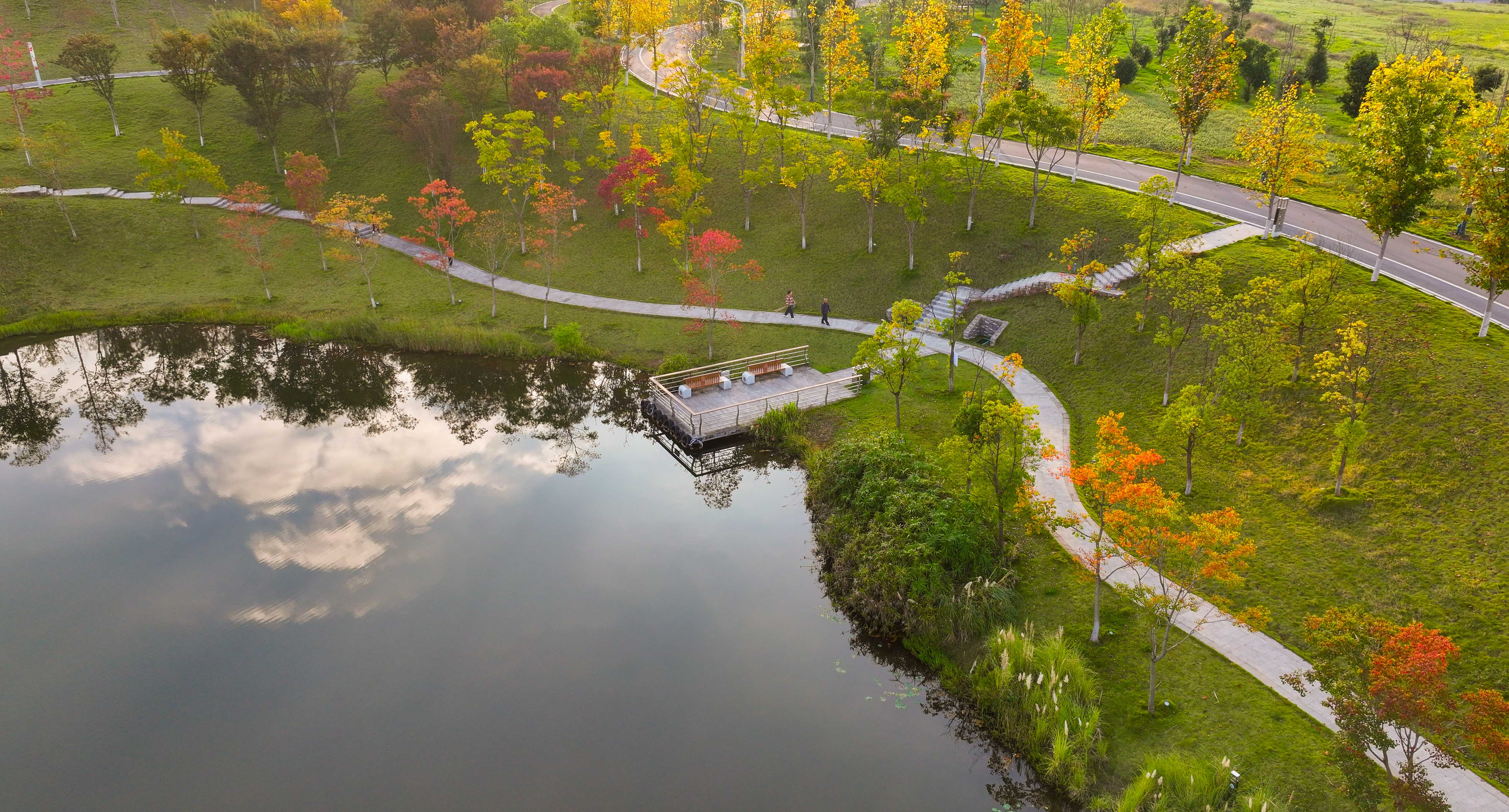 ▲10月30日,垫江县桂溪街道三合湖湿地公园,市民在散步(无人机照片)。特约摄影 龚长浩