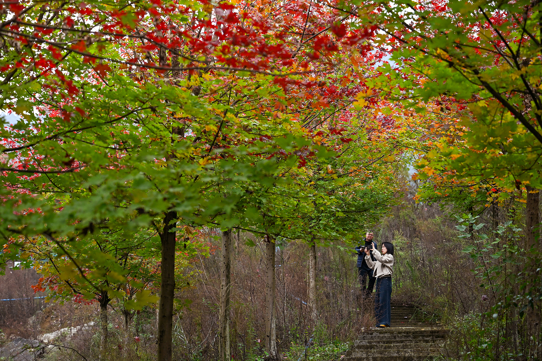 漫山的枫叶已完成大半色彩蜕变,由绿转黄,最终定格为热烈火红。层层叠叠的“枫”景与山间云雾相映,吸引不少市民前来,或在枫树下定格笑脸,或沿林间步道漫步赏景,手机、相机快门声此起彼伏,记录下深秋独有的诗意风光。