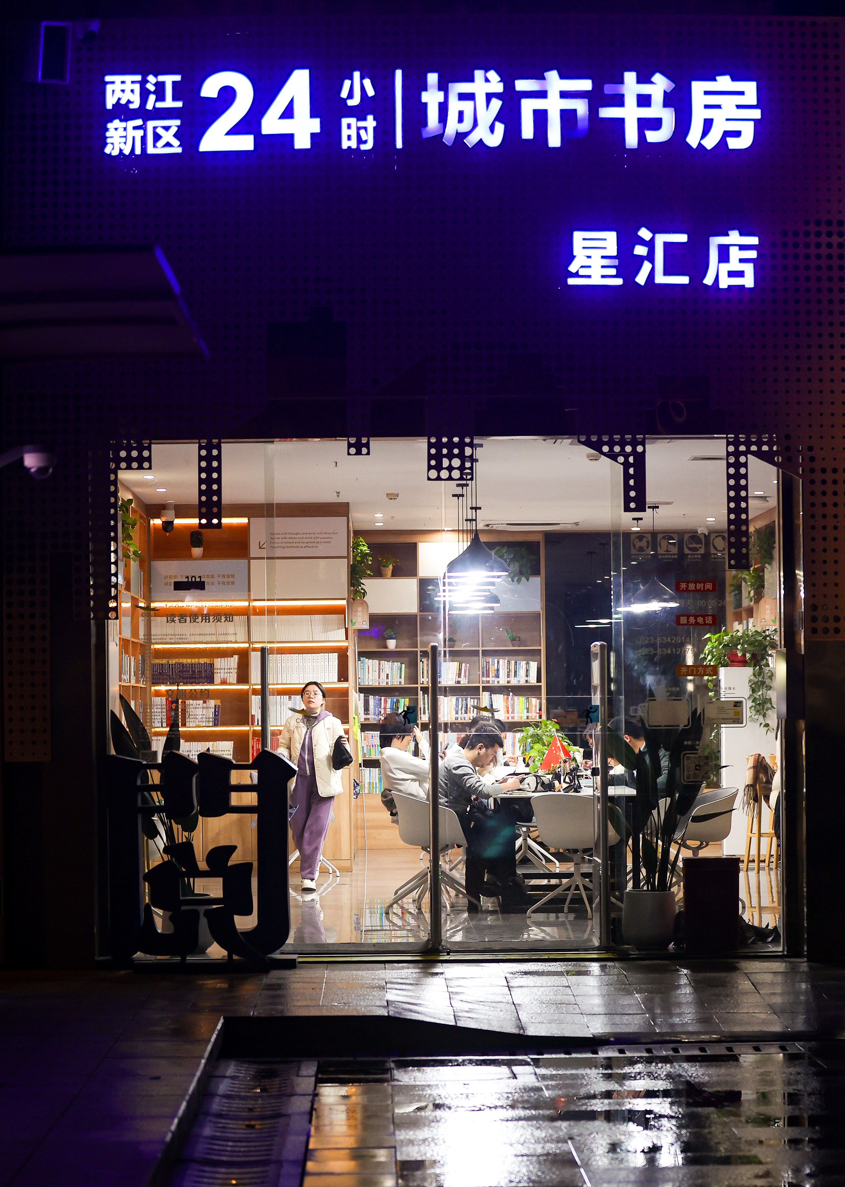 夜幕下,重庆两江新区24小时城市书房灯火通明。这里藏书丰富、温暖舒适,并全天候向市民开放,为上班族、学生、研学爱好者等提供深夜阅读空间。不打烊的书香,既满足市民多元阅读需求,也为城市添了份温暖文化底色。
