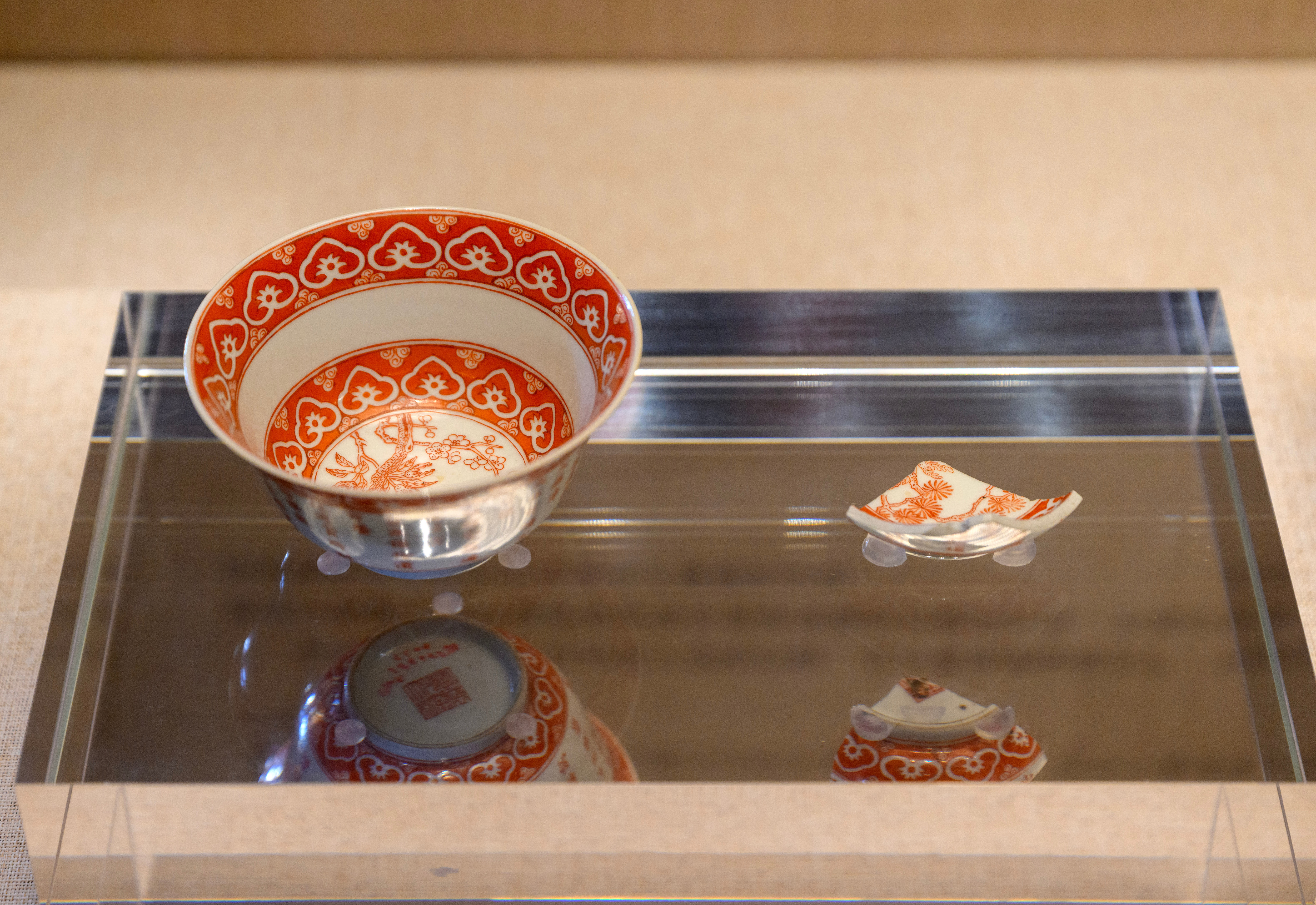 ▲这是展出的故宫造办处旧址出土的白釉矾红彩三清茶碗残片与故宫院藏清代白釉矾红彩三清茶碗(11月3日摄)。新华社记者 金良快 摄
