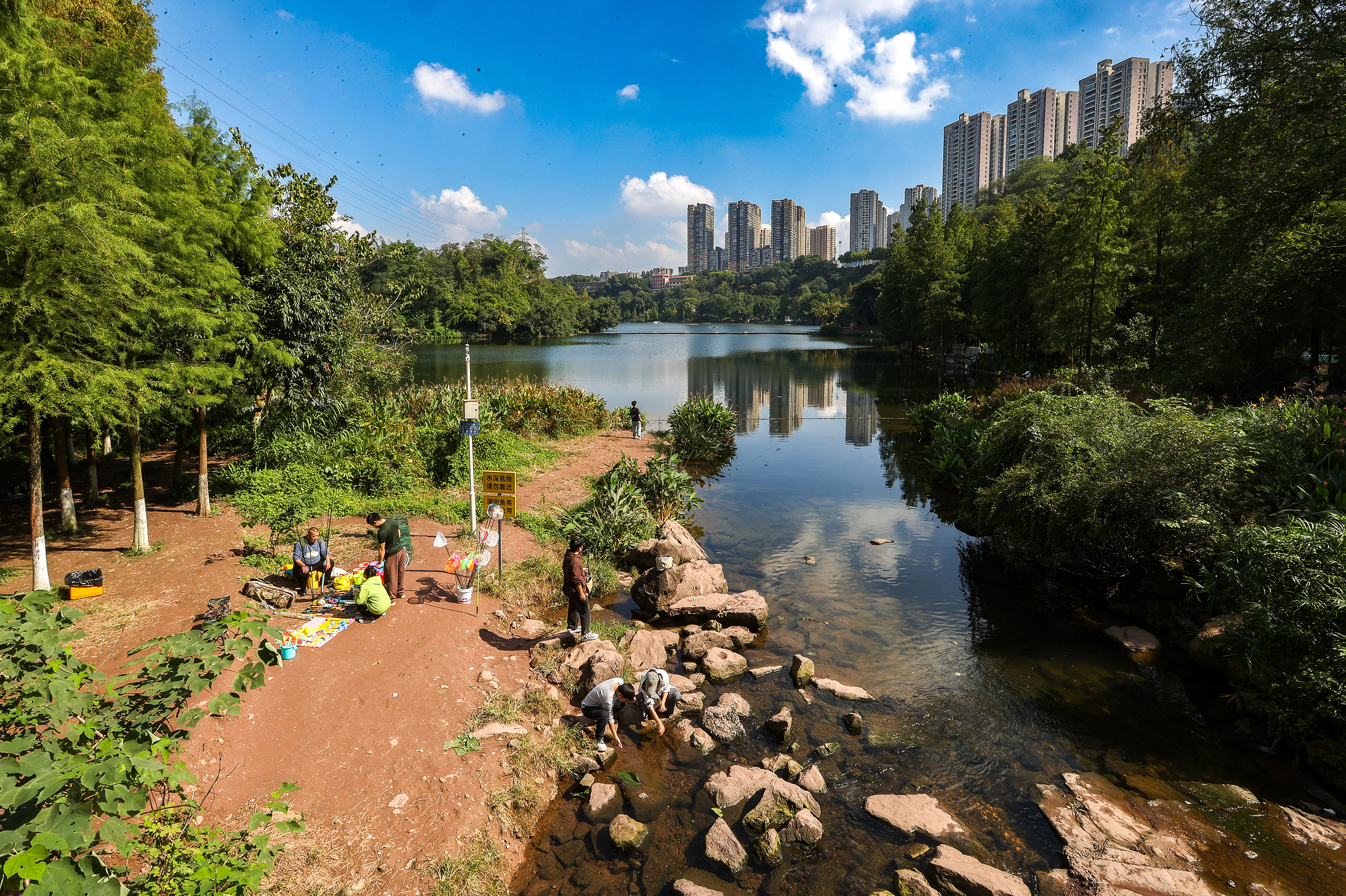 ▲11月4日,九龙坡区彩云湖国家湿地公园,市民在湖边玩耍。记者 尹诗语 摄