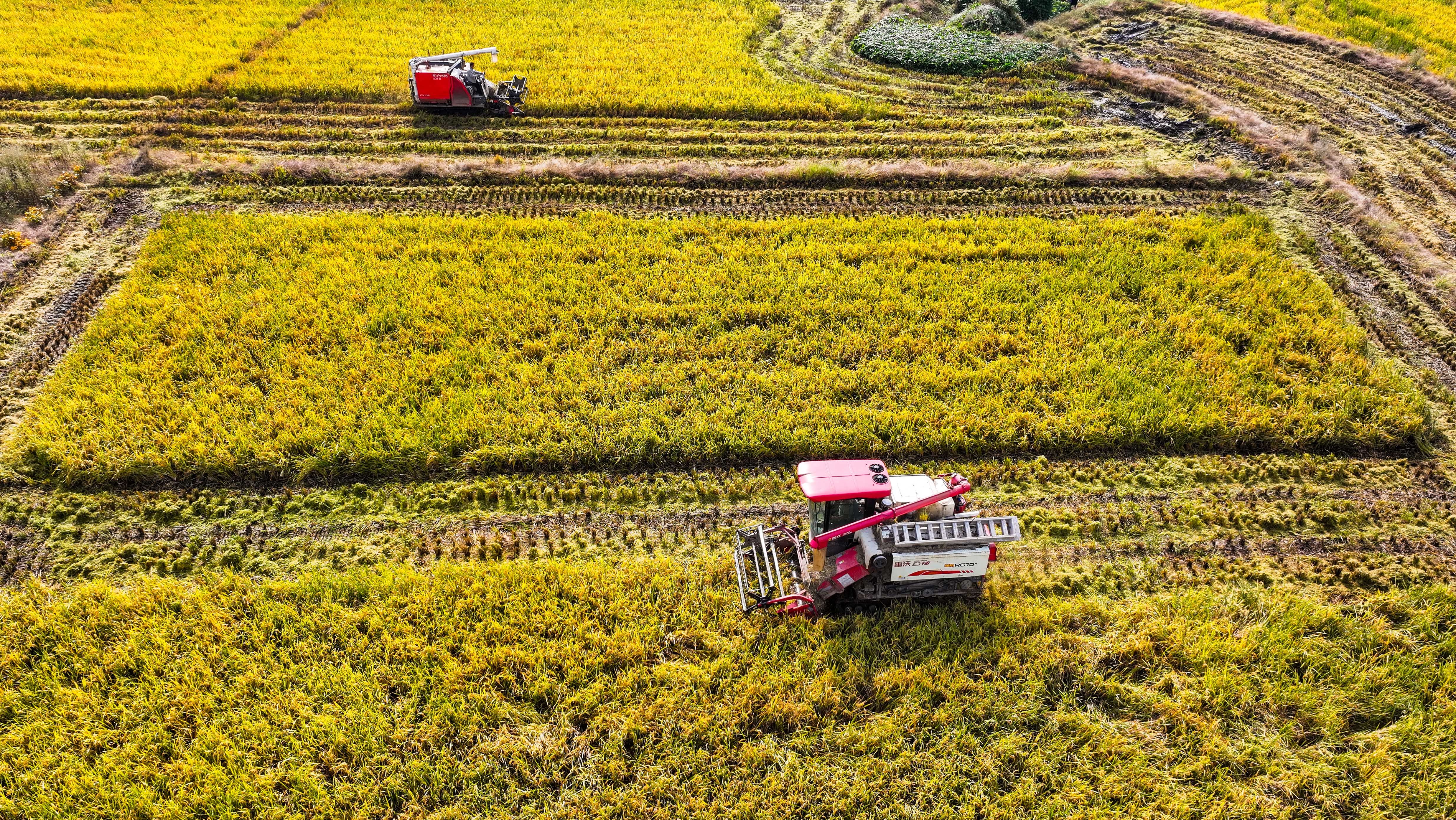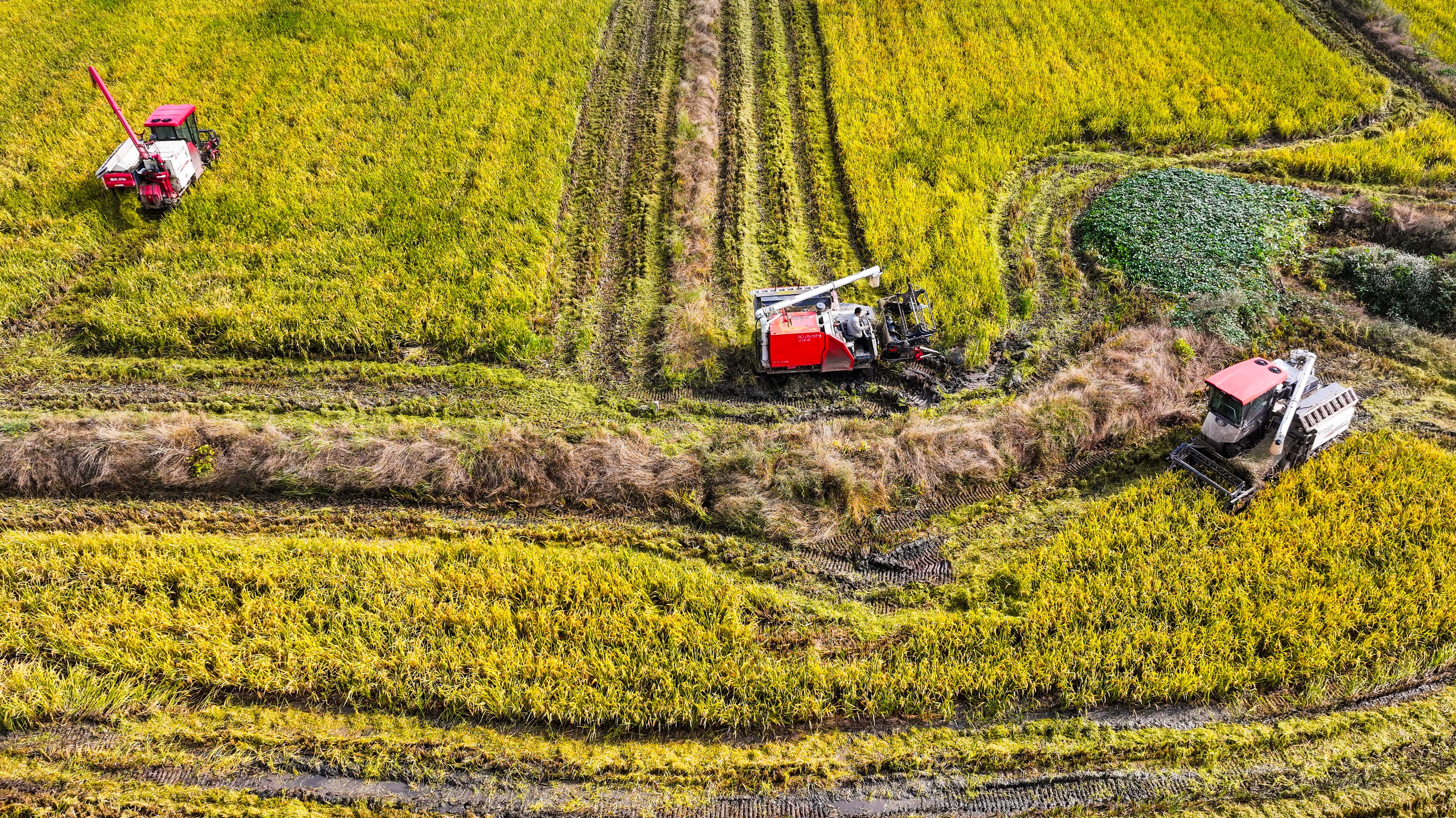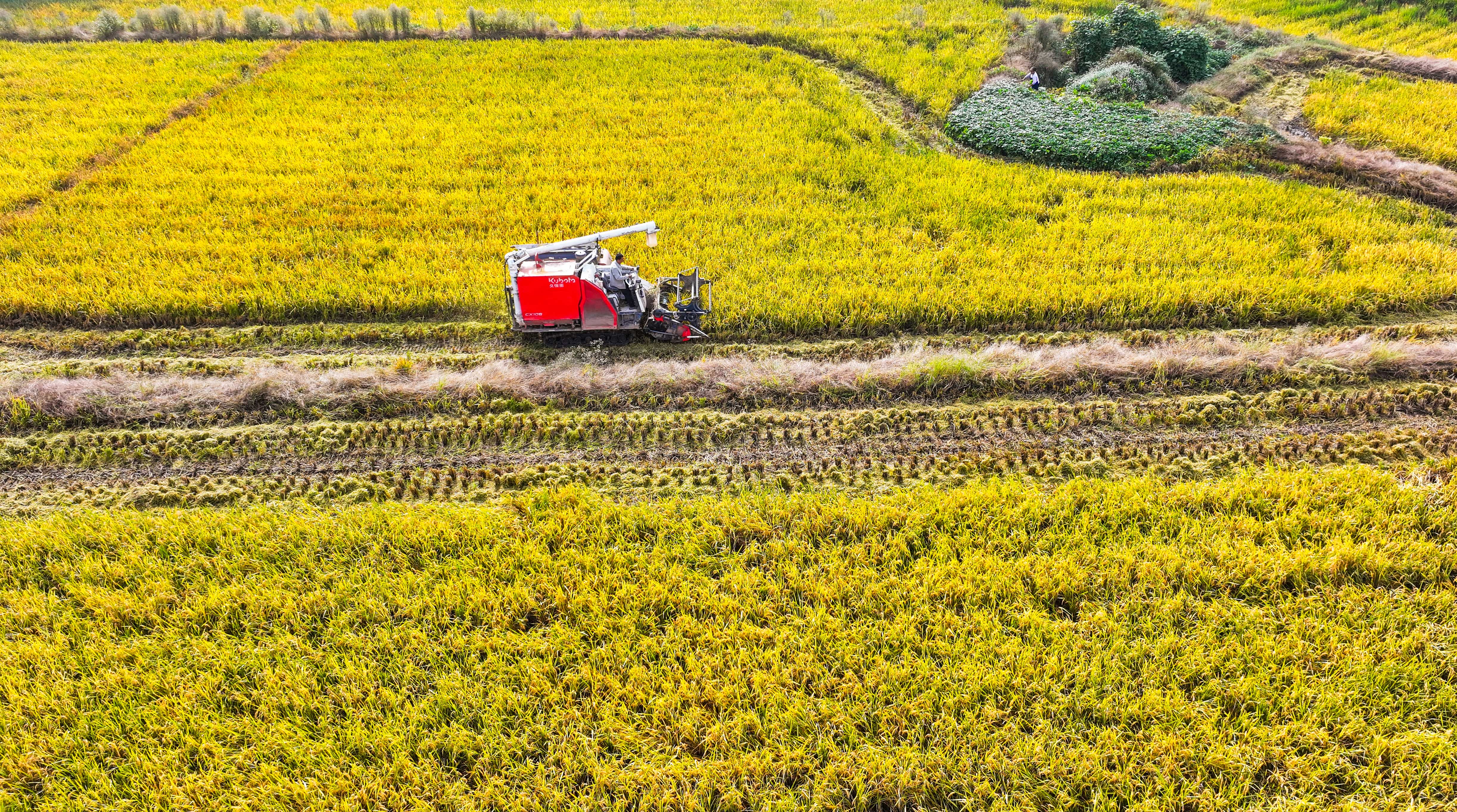 ▲2025年11月4日,垫江县普顺镇红岩村再生稻基地,农机穿梭在田间收获再生稻(无人机照片)。特约摄影 龚长浩