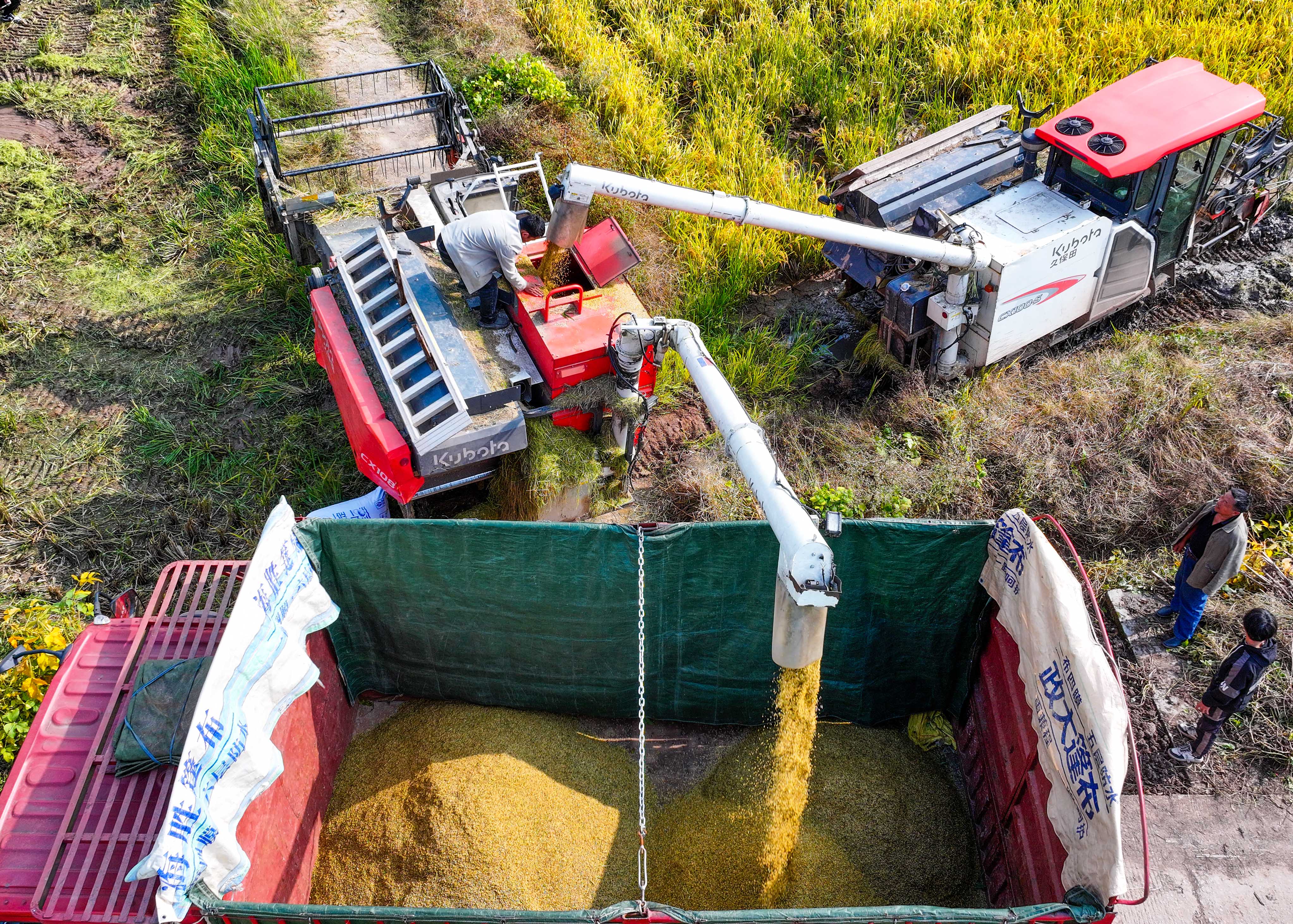 ▲11月4日,垫江县普顺镇红岩村再生稻基地,农机将收获的再生稻装车(无人机照片)。特约摄影 龚长浩