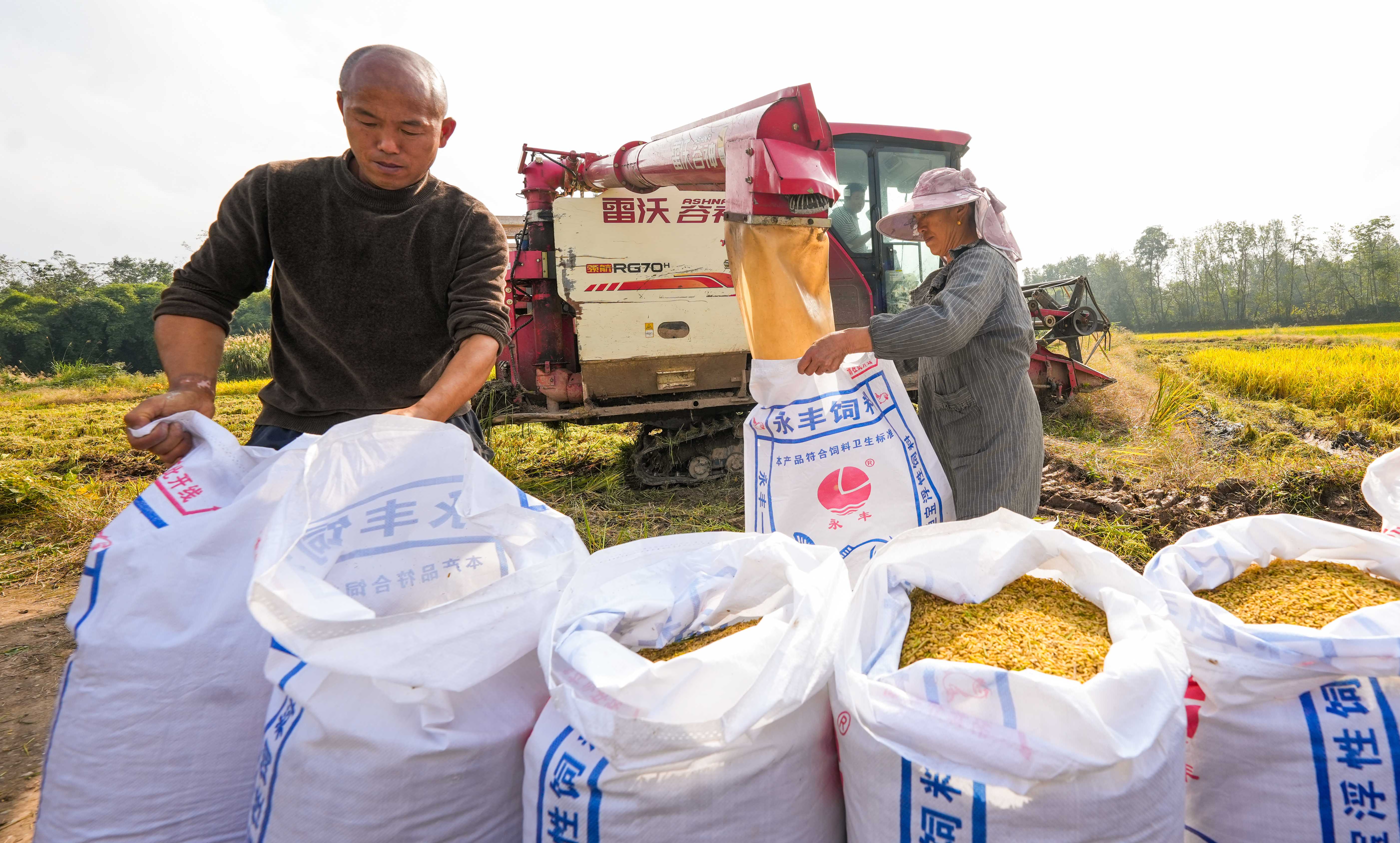 ▲11月4日,垫江县普顺镇红岩村再生稻基地,工人将收获的再生稻装袋。特约摄影 龚长浩