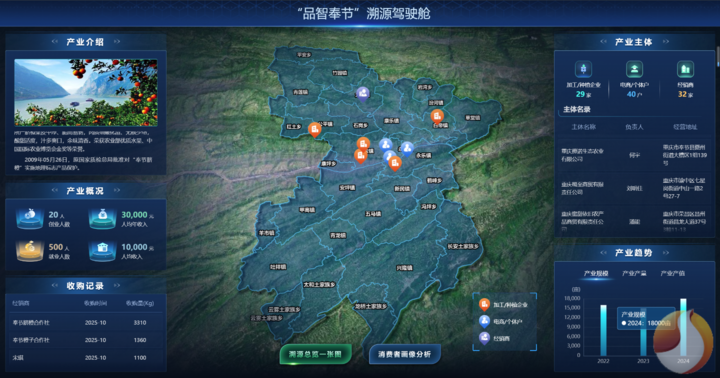 为让消费者吃上“放心果”,奉节县构建了集基础信息管理、追溯信息管理、一树一码管理、产品查询管理于一体的“AI好橙”系统,打通PC端与移动端,覆盖从农户到消费者的全链条。通过“一树一码”数字身份证,每颗脐橙都拥有专属“档案”,花果管理、病虫害防治、土水肥调控等关键环节数据实时录入;AI问答功能更能快速响应消费者咨询,提供检测报告、种植基地等详尽信息。与此同时,“品智奉节”溯源数字驾驶舱实现产业数据可视化,销售数据分析助力精准营销,既保障了消费权益,也为产业升级注入智慧动能。